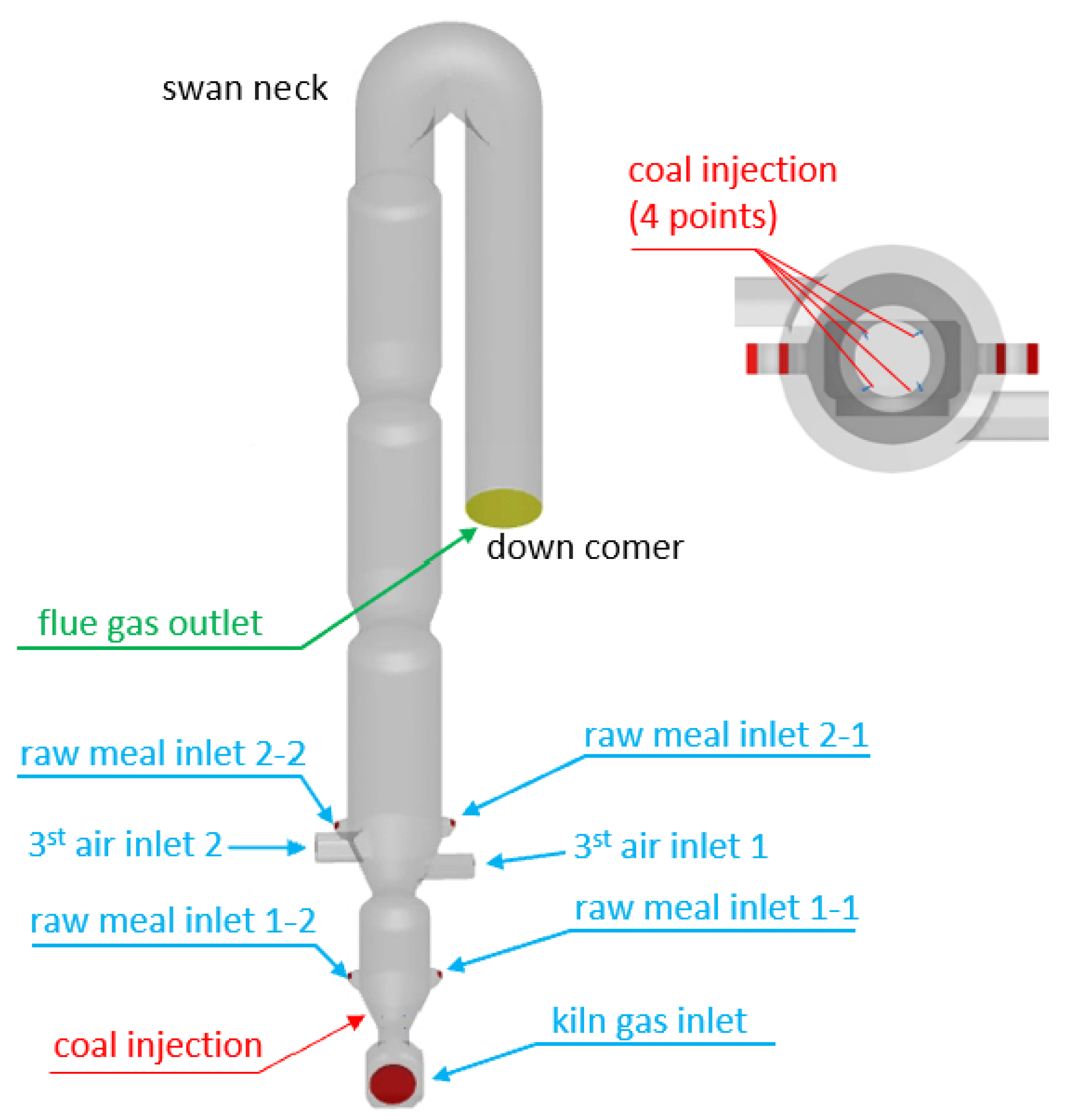 Figure 3, pulverized coal was injected through four symmetrically arranged feed points in the lower cone region. Raw meal was introduced through two vertically separated layers: an upper layer positioned above the tertiary air duct and a lower layer located above the lower cone, with each layer fed symmetrically through left and right injection points. The chemical composition of the raw meal and the proximate analysis of the coal are provided in