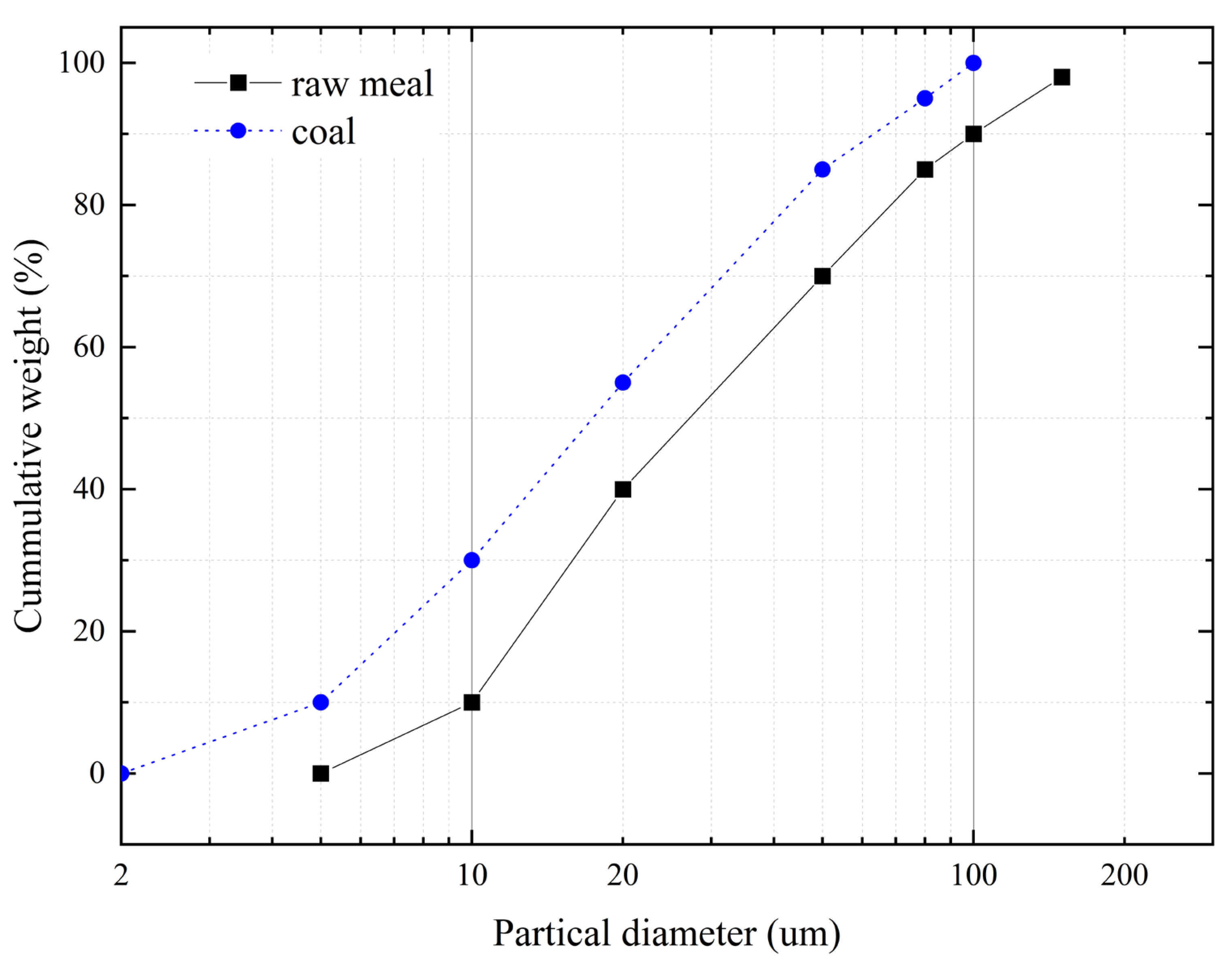 Table 3. The particle size distribution of the raw meal and coal was shown in