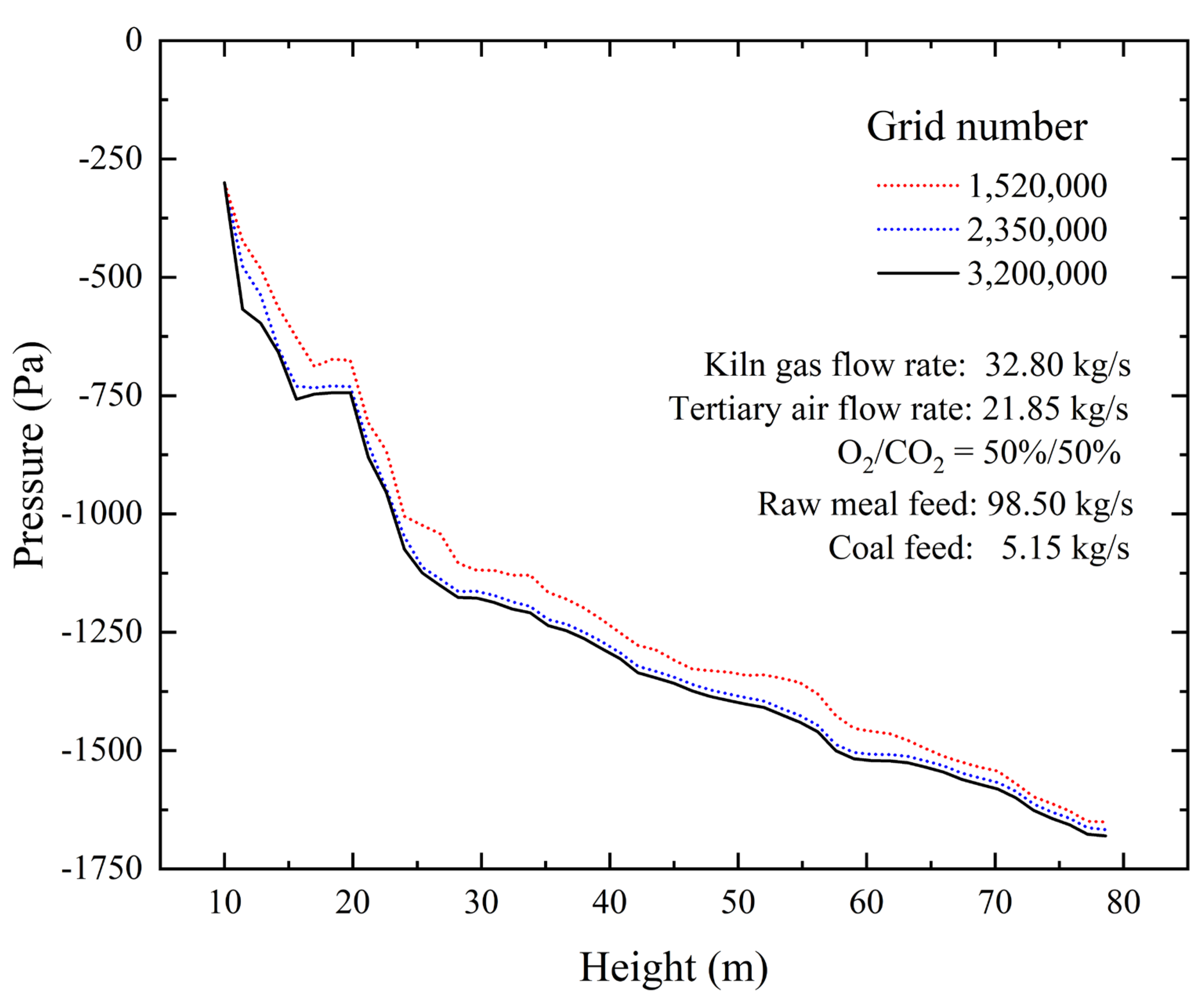 The present simulation was conducted under a typical oxy-fuel condition with 50% oxygen concentration in the tertiary air. This condition resulted in a 38.4% increase in the solid-to-gas ratio compared to conventional air combustion. It should be noted that the oxygen concentration is intrinsically linked to the CO2 flue gas recirculation ratio. A decrease in recirculated CO2 leads to higher oxygen concentration, while an increase in CO2 recirculation results in correspondingly lower oxygen levels. The 50% O2 condition was selected as the optimal operating point after comparative analysis of multiple simulation cases. Further sensitivity analysis reveals that elevated oxygen concentrations with reduced CO2 recirculation would lead to lower gas flow rates. This would further increase the solid-to-gas ratio and consequently raise the risk of material collapse within the calciner. Conversely, lower oxygen concentrations with increased CO2 recirculation would result in higher flue gas volumes, leading to greater heat loss and adversely affecting energy efficiency.