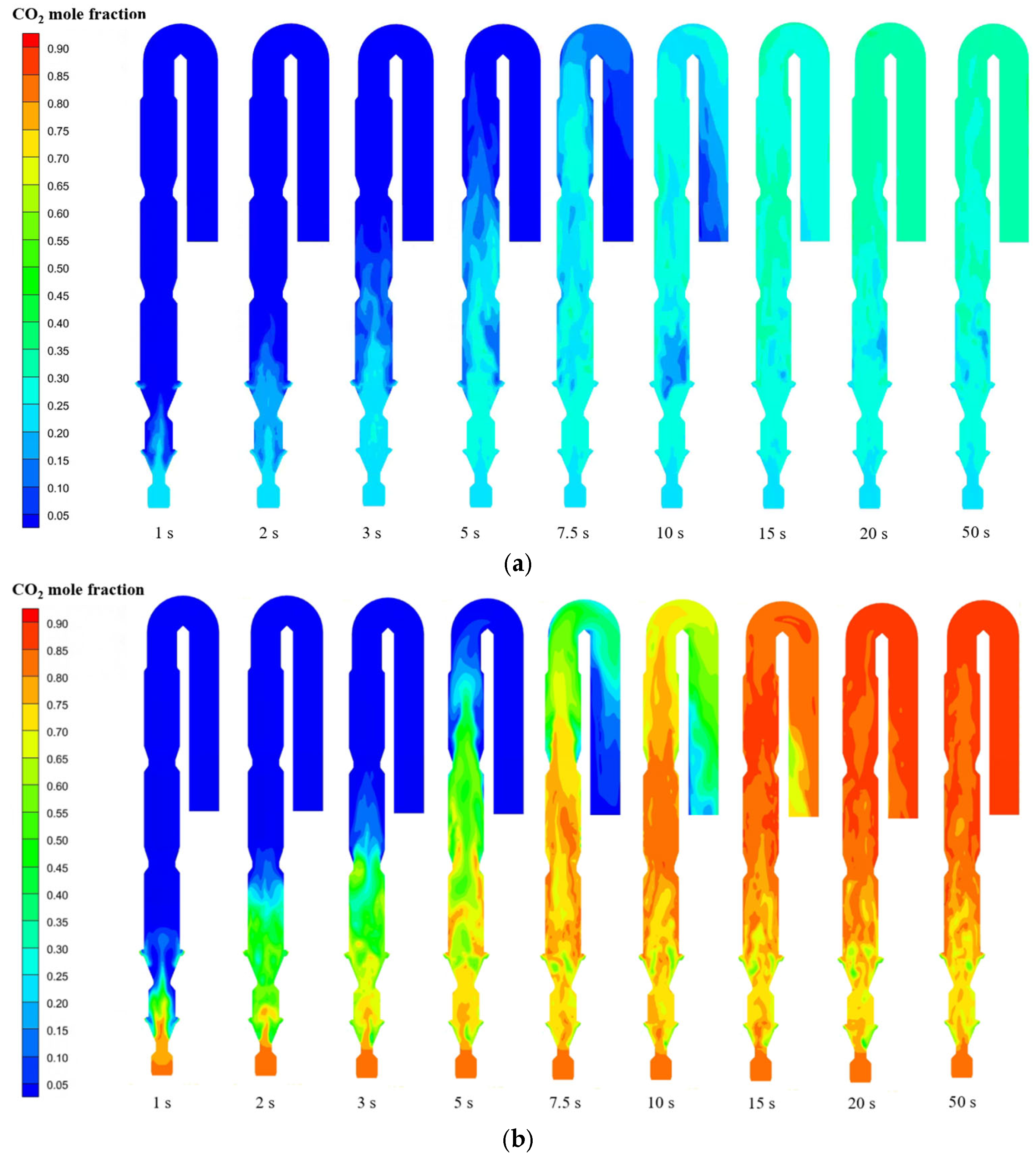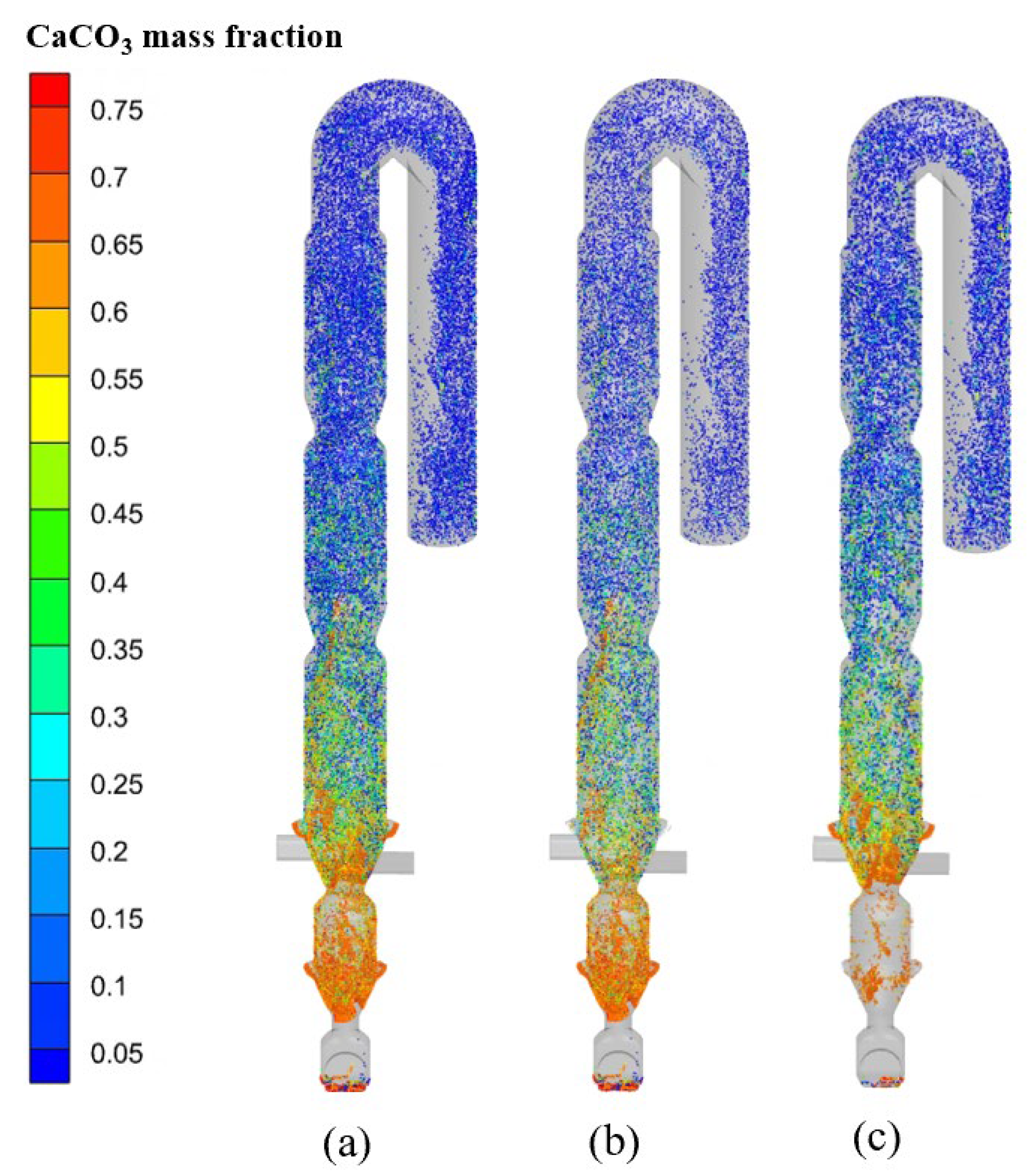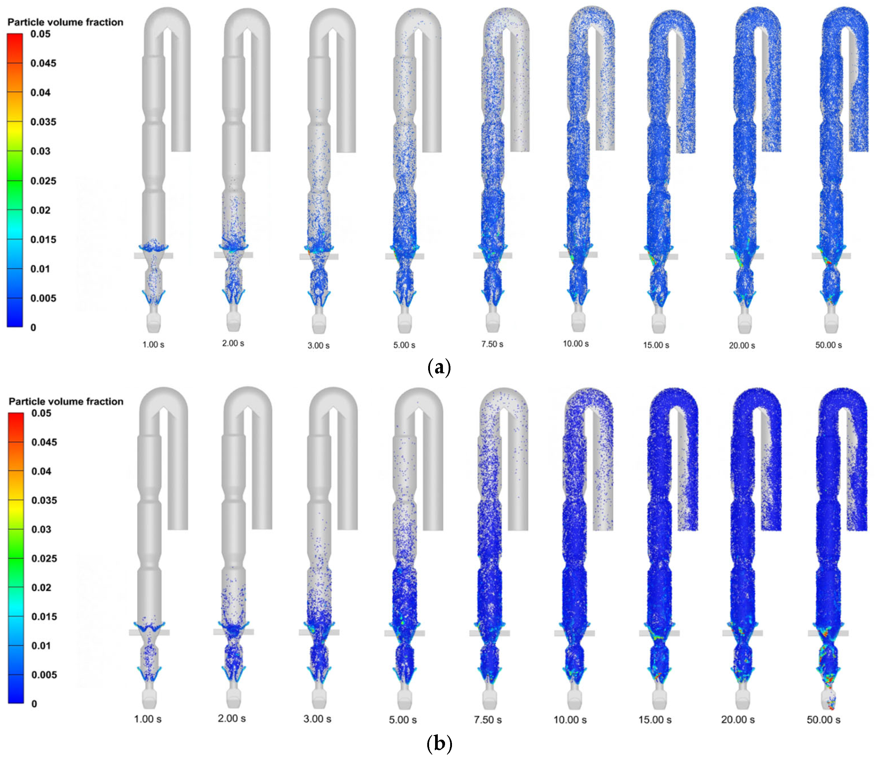 Figure 7 illustrates the temporal evolution of particle motion in the calciner. During the initial 0–10 s period, raw meal introduced through the suspension duct exhibits downward movement followed by upward countercurrent motion along the gas flow direction. This flow reversal results from fluid resistance effects generated by the concurrent introduction of kiln exhaust gas and tertiary air. The system achieves progressive stabilization after 15 s, with both hydrodynamic patterns and particle dynamics reaching steady-state conditions. The flow regime demonstrates distinct spatial characteristics: turbulent fluidization predominates in the constricted section beneath the raw meal feeding point, where high-speed jet airflow promotes effective particle dispersion. Above this region, the columnar section functions as a dilute phase zone, with particles being transported upward by the gas stream. The particles complete their trajectory through the system by passing sequentially through the gooseneck and downward pipeline before ultimately exiting the calciner.