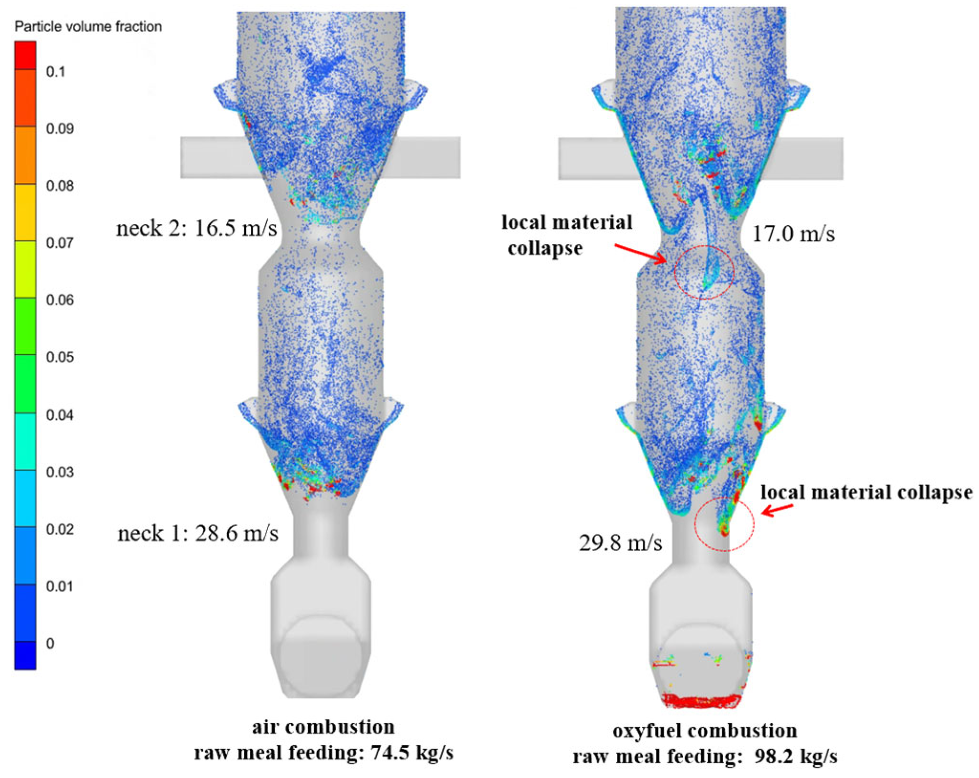 Figure 8 presents a comparative analysis of particle distribution within the raw meal feeding section under air and oxy-fuel combustion conditions. Simulation results for the calciner show the bottom throat maintains average gas velocities between 28 and 30 m/s. Specifically, air combustion conditions yield a velocity of 28.6 m/s with a solid-to-gas mass ratio of 1.25, while oxy-fuel combustion produces 29.8 m/s with a corresponding ratio of 1.73. This represents a 38.4% increase in solid loading under oxy-fuel operation. The simulated flow patterns reveal distinct behavioral differences: air combustion enables complete raw meal dispersion without material accumulation, while oxy-fuel combustion with its higher feeding rates and solid loading leads to localized material collapse in the bottom throat region.