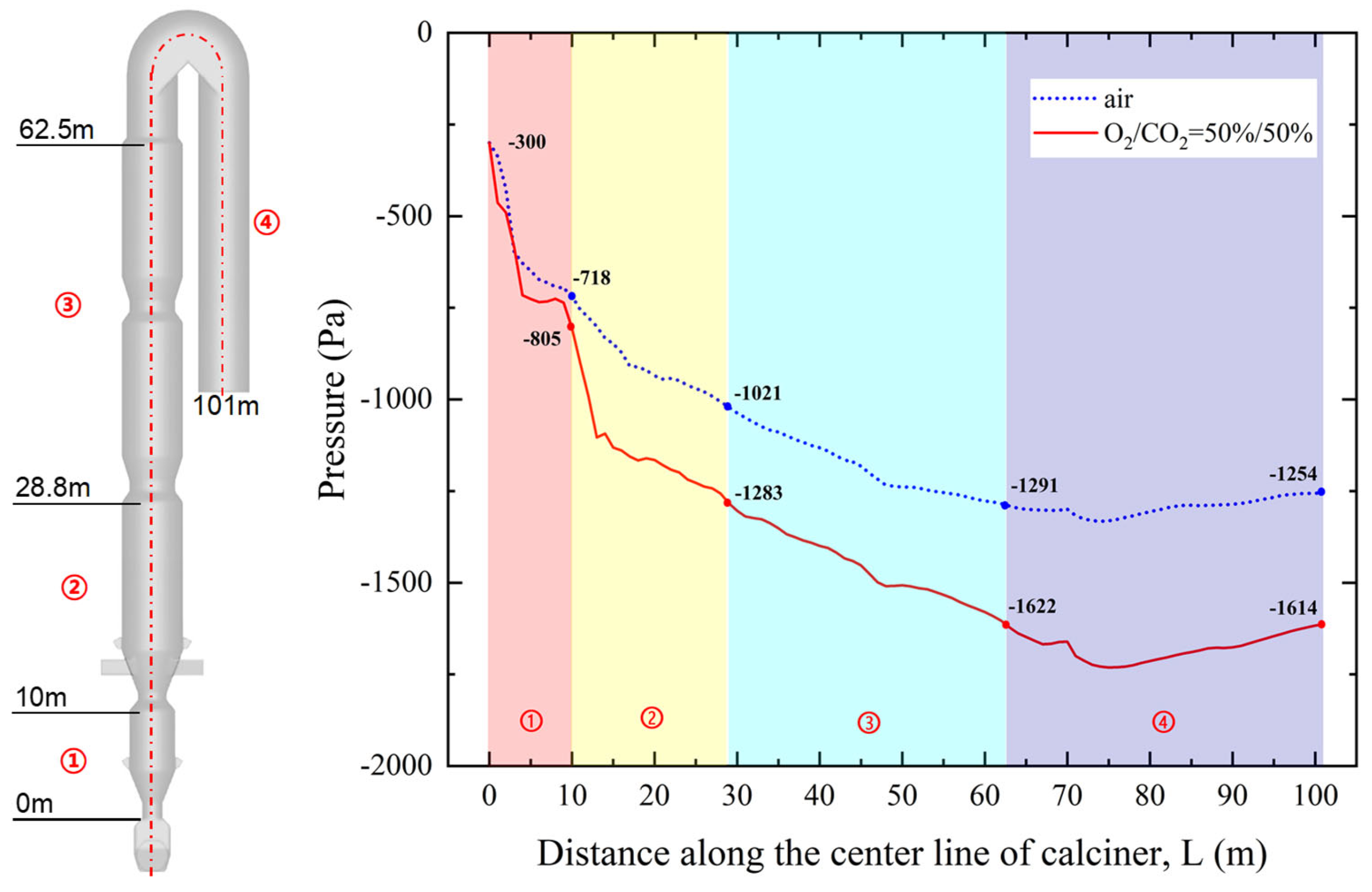 To localize the source of this increased pressure drop, the calciner was divided into four distinct zones along its length: the Reducing Zone (0–10 m) between the bottom throat and first column section; Combustion Zone 1 (10–28.8 m) between the second throat and second column section; Combustion Zone 2 (28.8–62.5 m) encompassing the third and fourth throats with their column sections; and the Reverse Downflow Zone (62.5–101 m) connecting the top gooseneck to the downward pipeline. Analysis shows that approximately 69% of the additional pressure drop in oxy-fuel combustion occurs in the Reducing Zone and Combustion Zone 1.