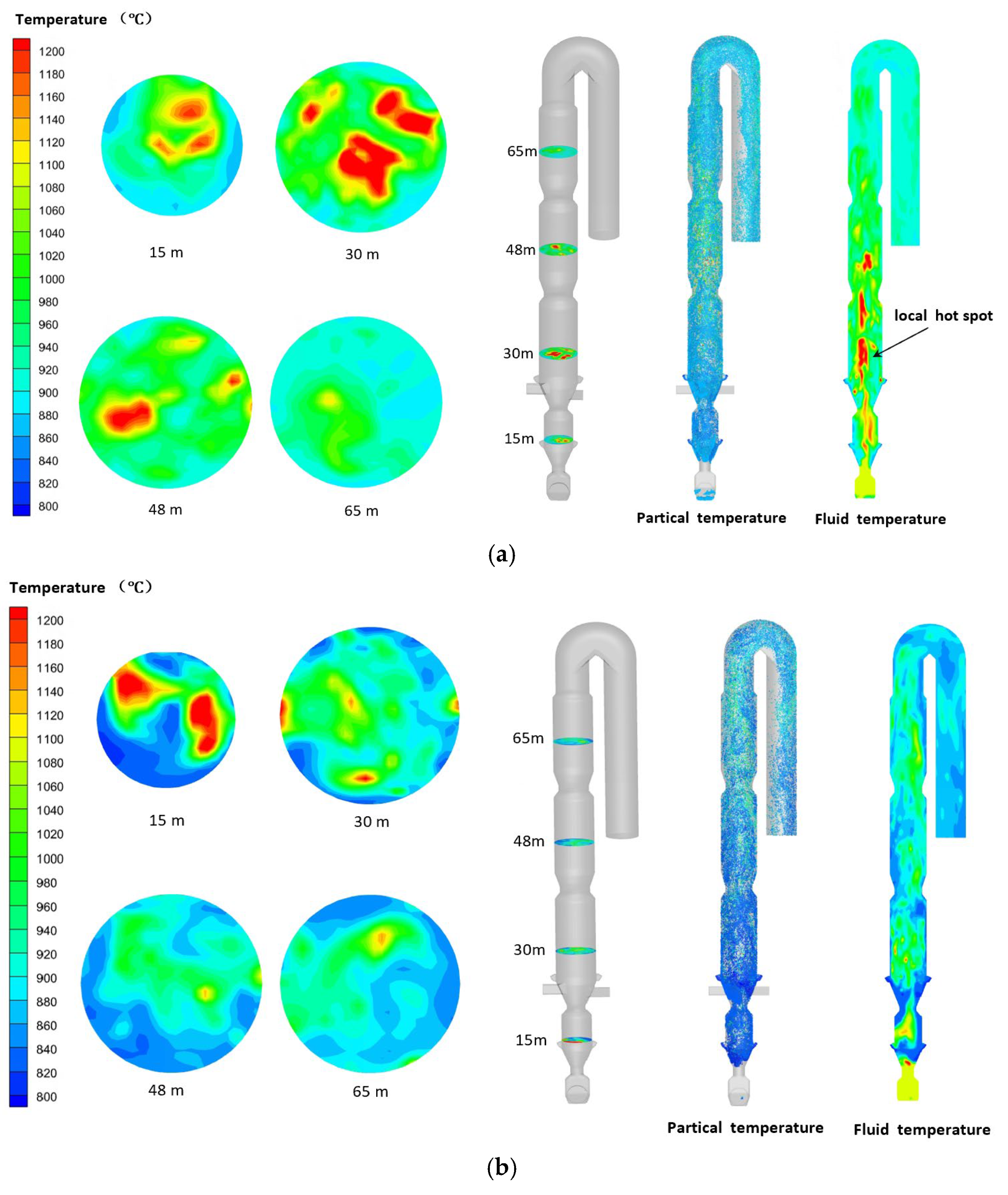 To analyze the temperature distribution under different combustion conditions, four horizontal planes were selected at heights of 15 m, 30 m, 48 m, and 65 m. These correspond to key regions within the calciner: the 15 m plane in the middle of the reducing zone, the 30 m plane in combustion zone 1, and the 48 m and 65 m planes within the two column sections of combustion zone 2. As shown in