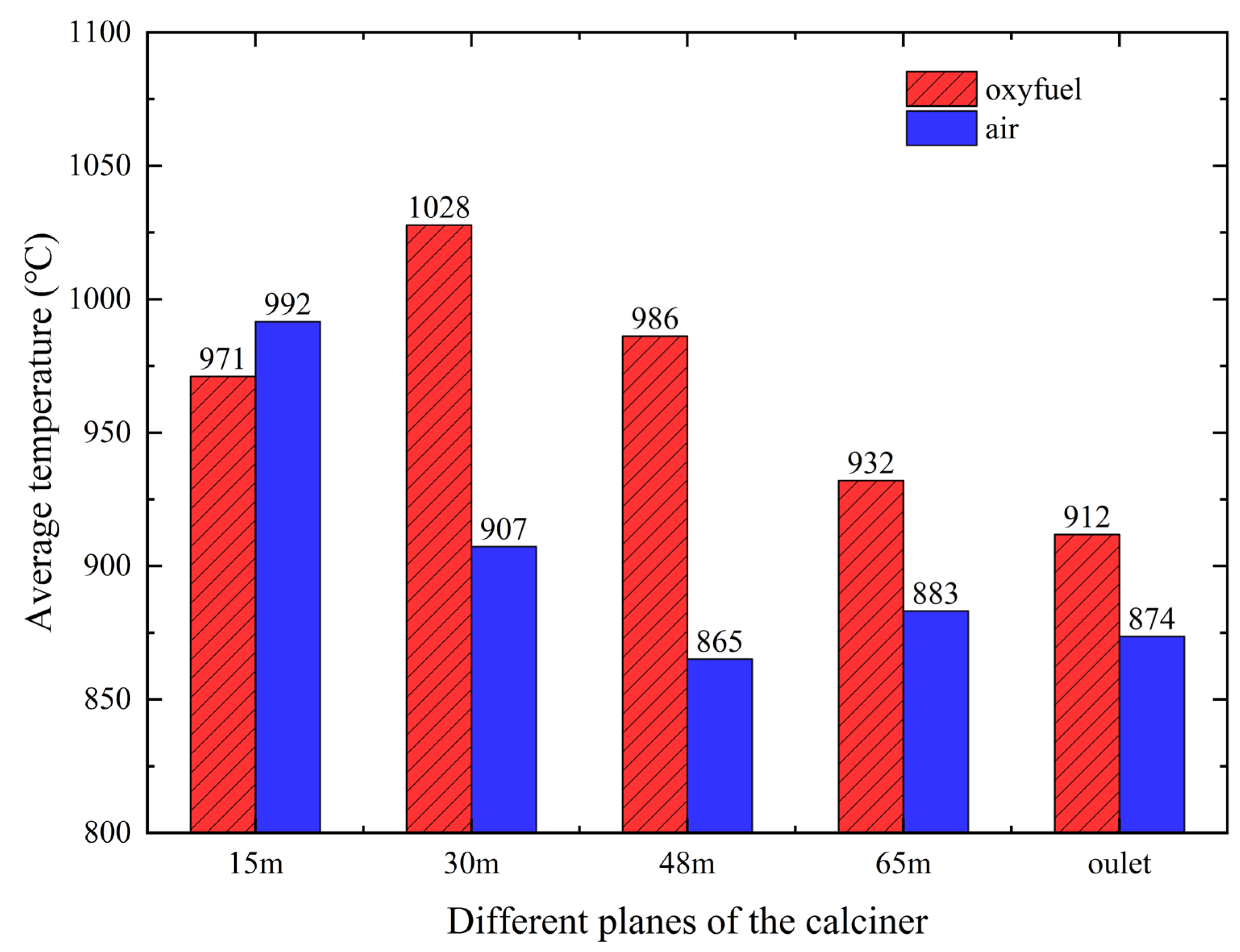 Figure 12 further compares the average temperatures across different calciner planes between oxy-fuel and air combustion. The increased raw meal feeding rate under oxy-fuel operation enhances heat absorption in the reducing zone, lowering the raw material temperature by 21 °C compared to air combustion. However, upon entering the combustion zone, the elevated decomposition temperature under high CO