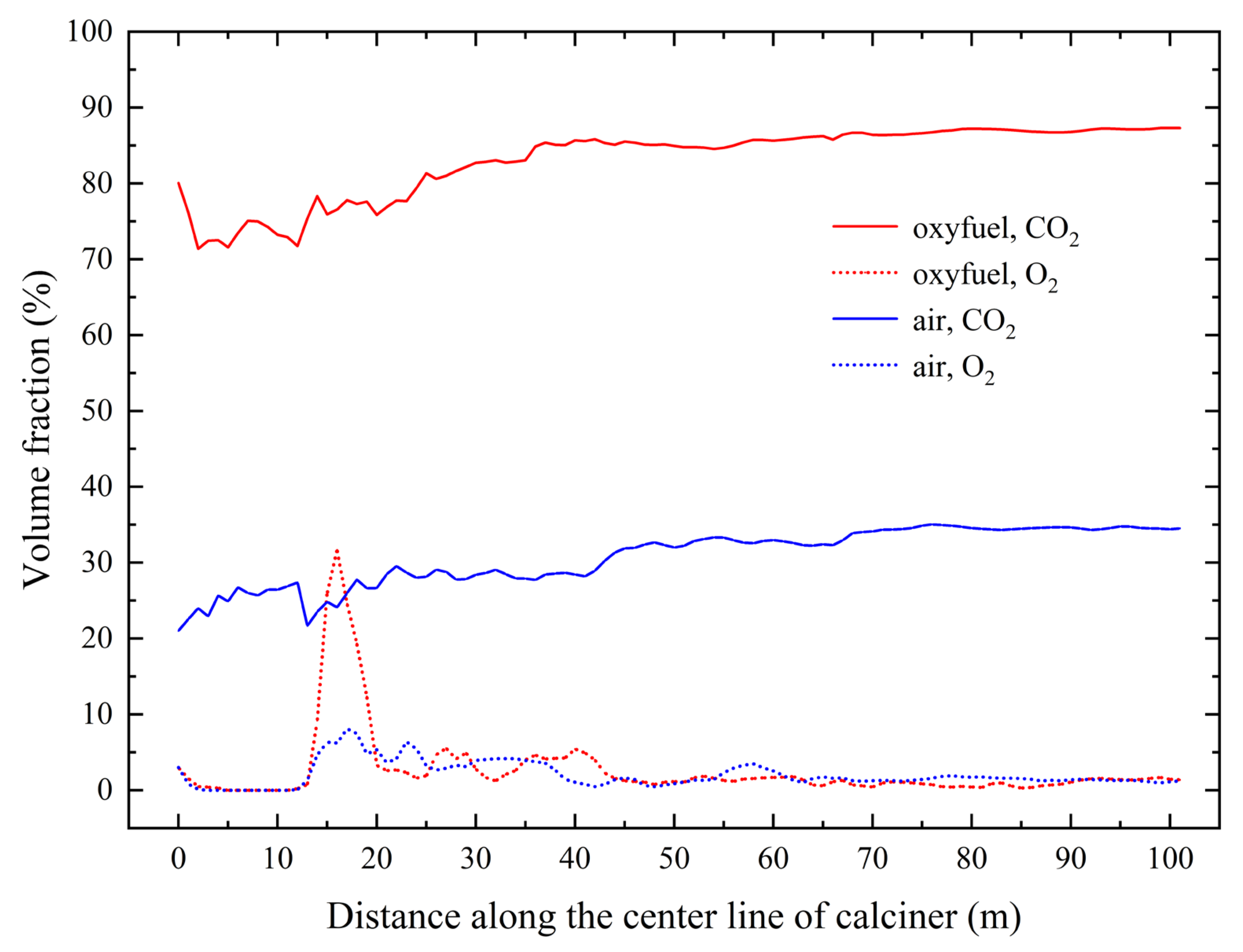 2 concentration reaches 83.1% throughout the calciner, with the outlet concentration attaining 87.3%. In contrast, conventional air combustion produces an average concentration of 31.0% and an outlet value of 34.4%, confirming the substantial enhancement in CO