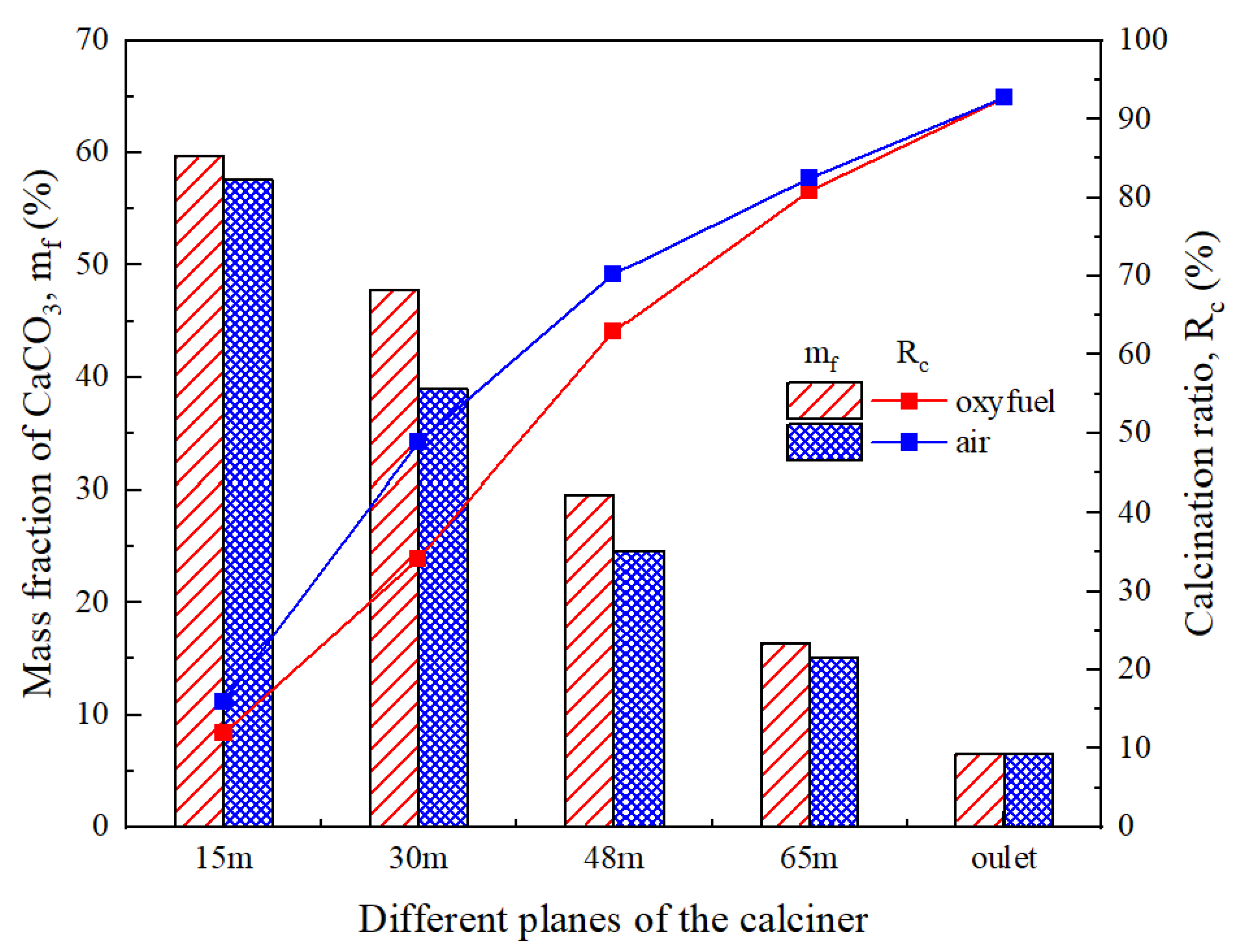 2 concentration within the calciner, which thermodynamically suppresses calcination. However, with the higher operating temperatures characteristic of oxy-fuel combustion, the decomposition rate accelerates markedly beyond the 30 m plane. Ultimately, the calciner outlet achieves a decomposition rate of 92.7% under oxy-fuel operation, demonstrating performance parity with conventional air combustion and meeting the material preparation requirements for the rotary kiln.