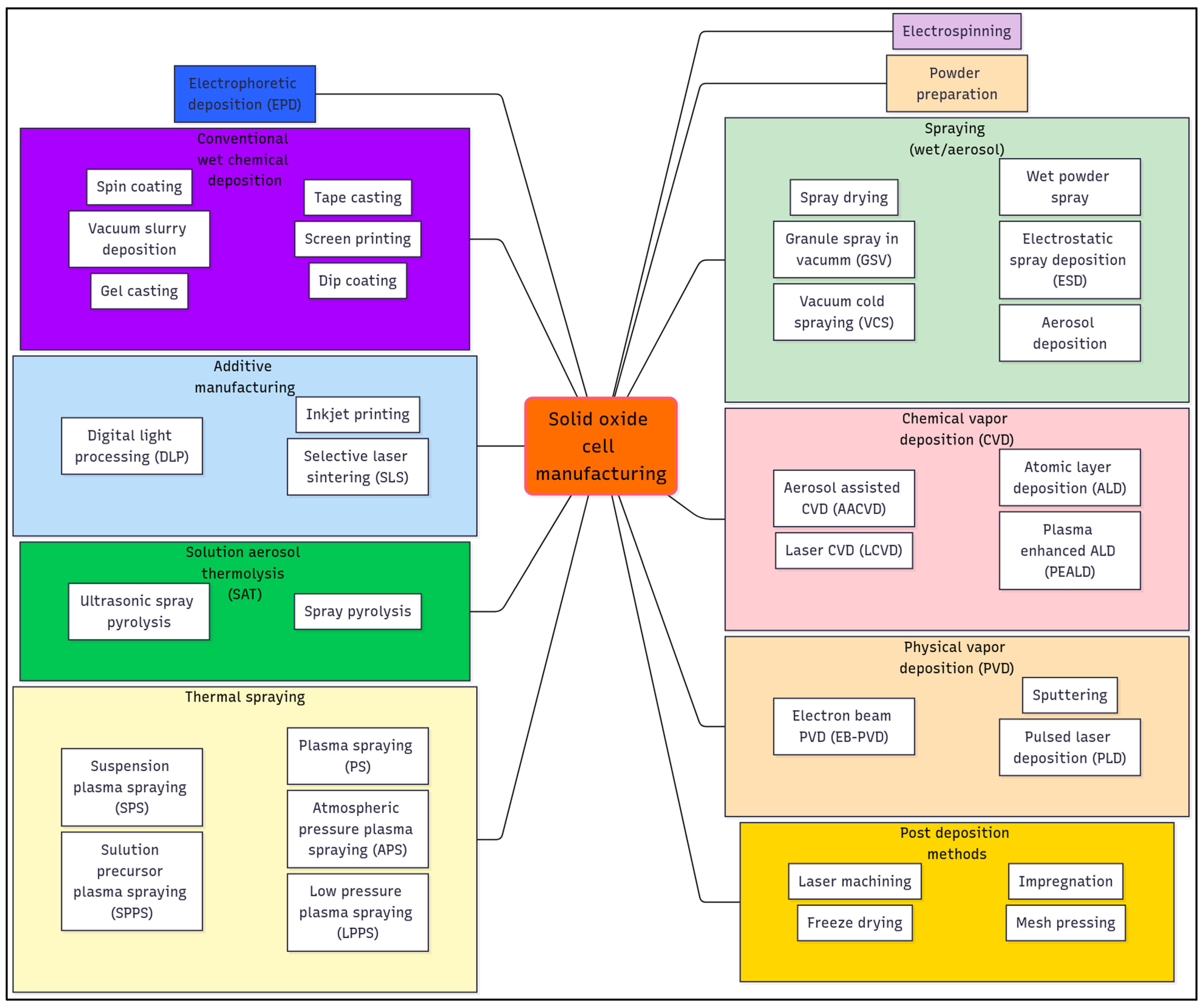 It is evident that certain manufacturing methods, such as PVD, CVD, and electrospinning, offer unique opportunities for SOC design enhancements, yet their elevated equipment costs and limited production rates currently set a high barrier to economic feasibility. To support the future ramp-up of SOC technology, robust techno-economic analyses will be required to identify when these methods might become cost-effective. While their rational application under present production scales is doubtful, their adoption in large-scale, high-volume manufacturing may become realistic.