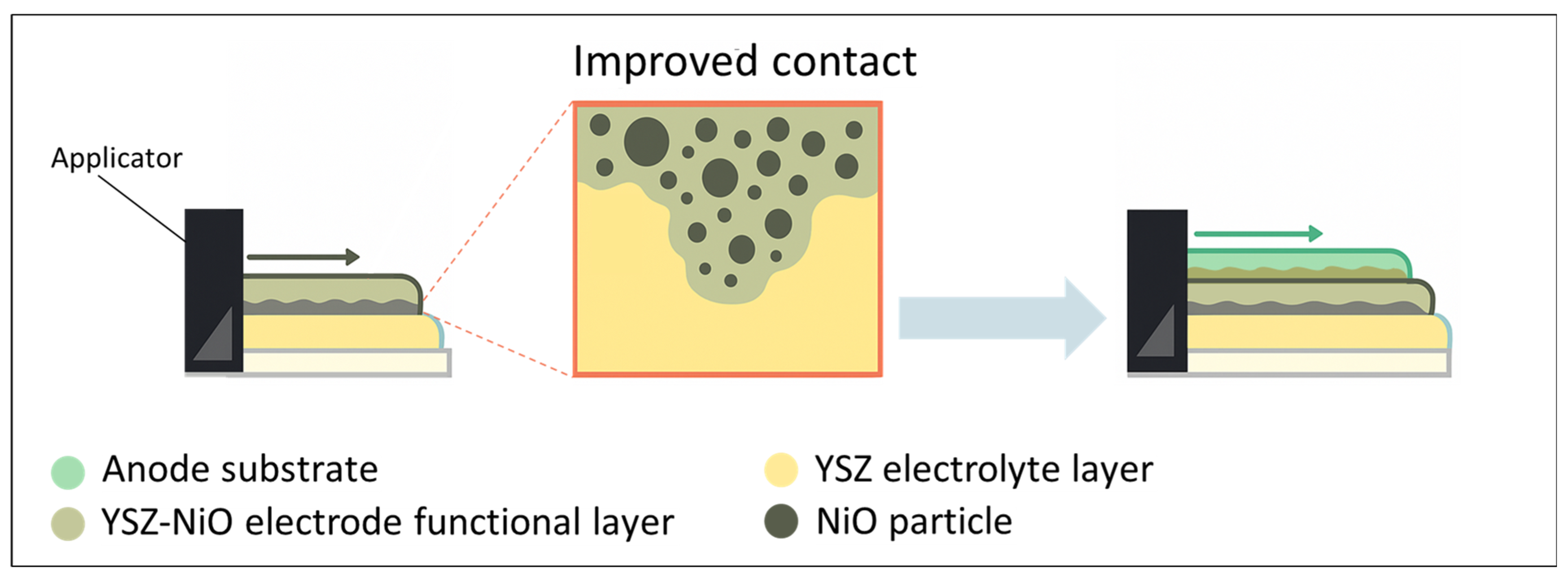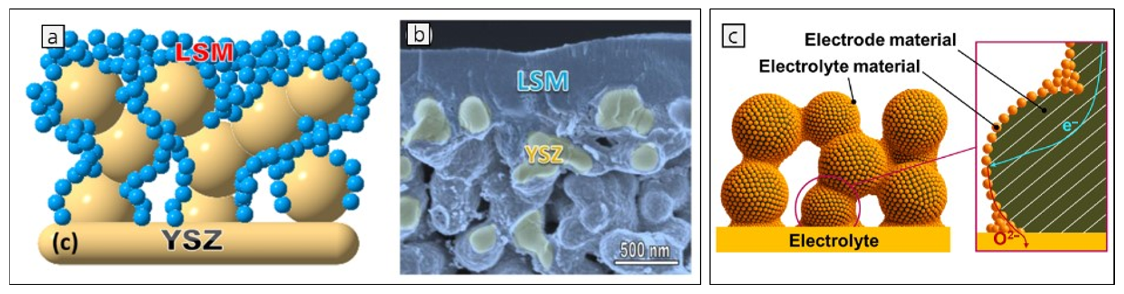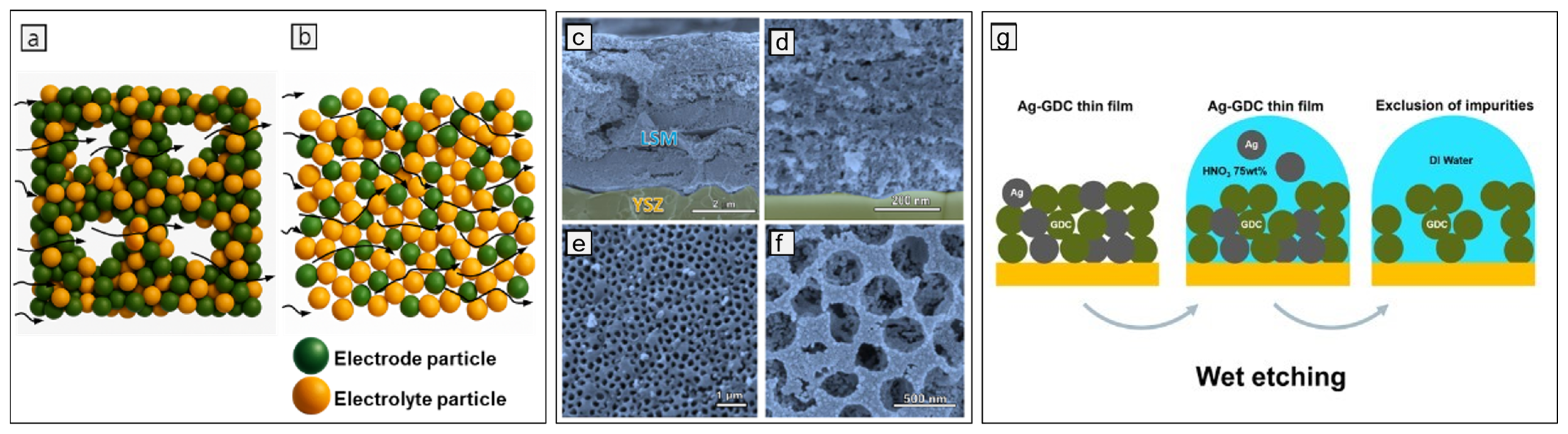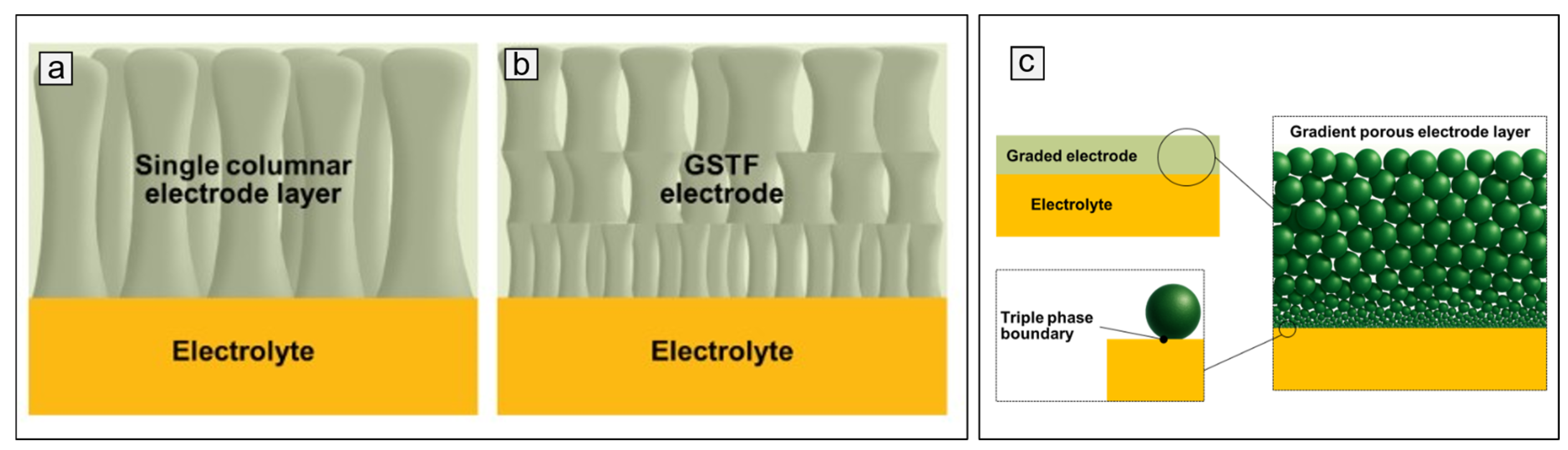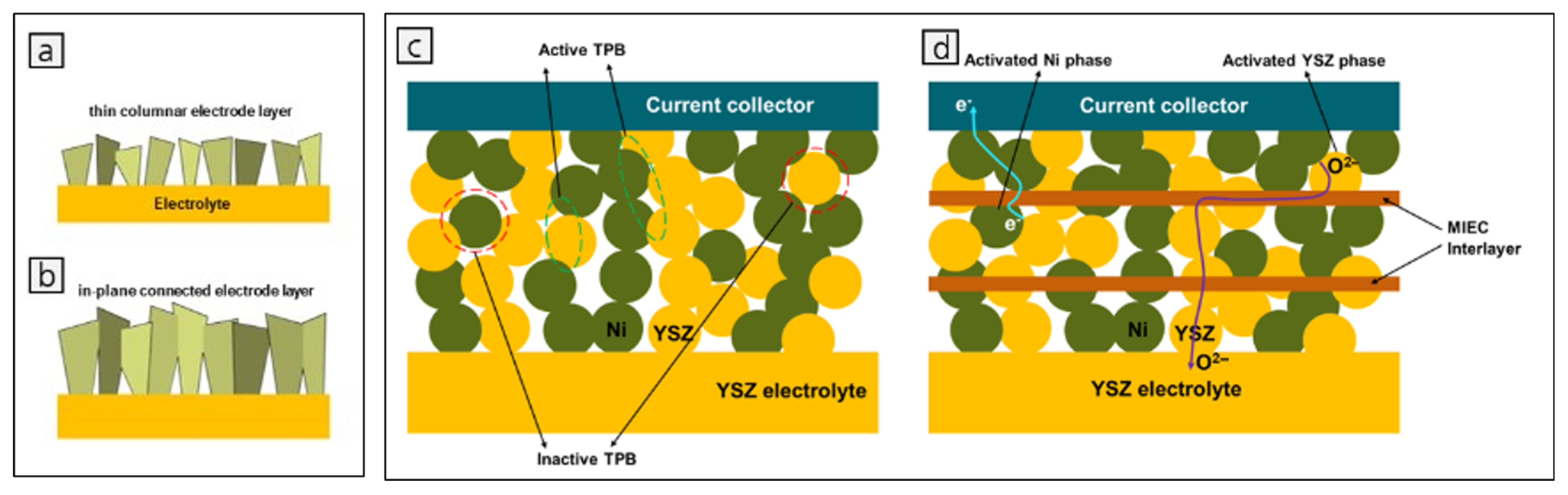 Conversely, electrode layers must be porous to ensure efficient reactant supply and removal. At the electrode–electrolyte interface, the microstructure must balance ion-conducting and electron-conducting phases with suitable porosity to maximize the triple-phase boundary (TPB). Accordingly, a functional interlayer is frequently employed between the outer electrode component and the electrolyte [
