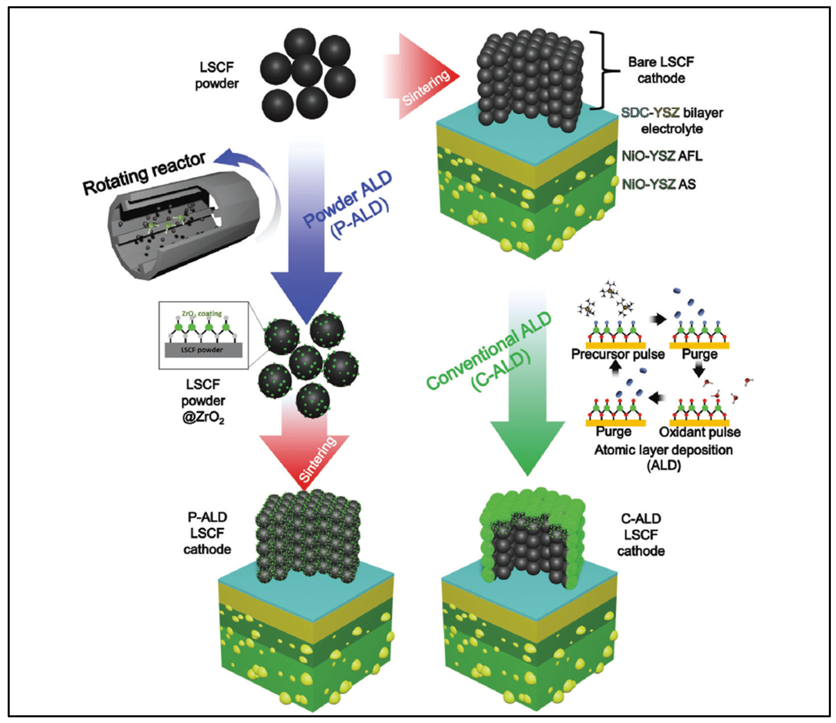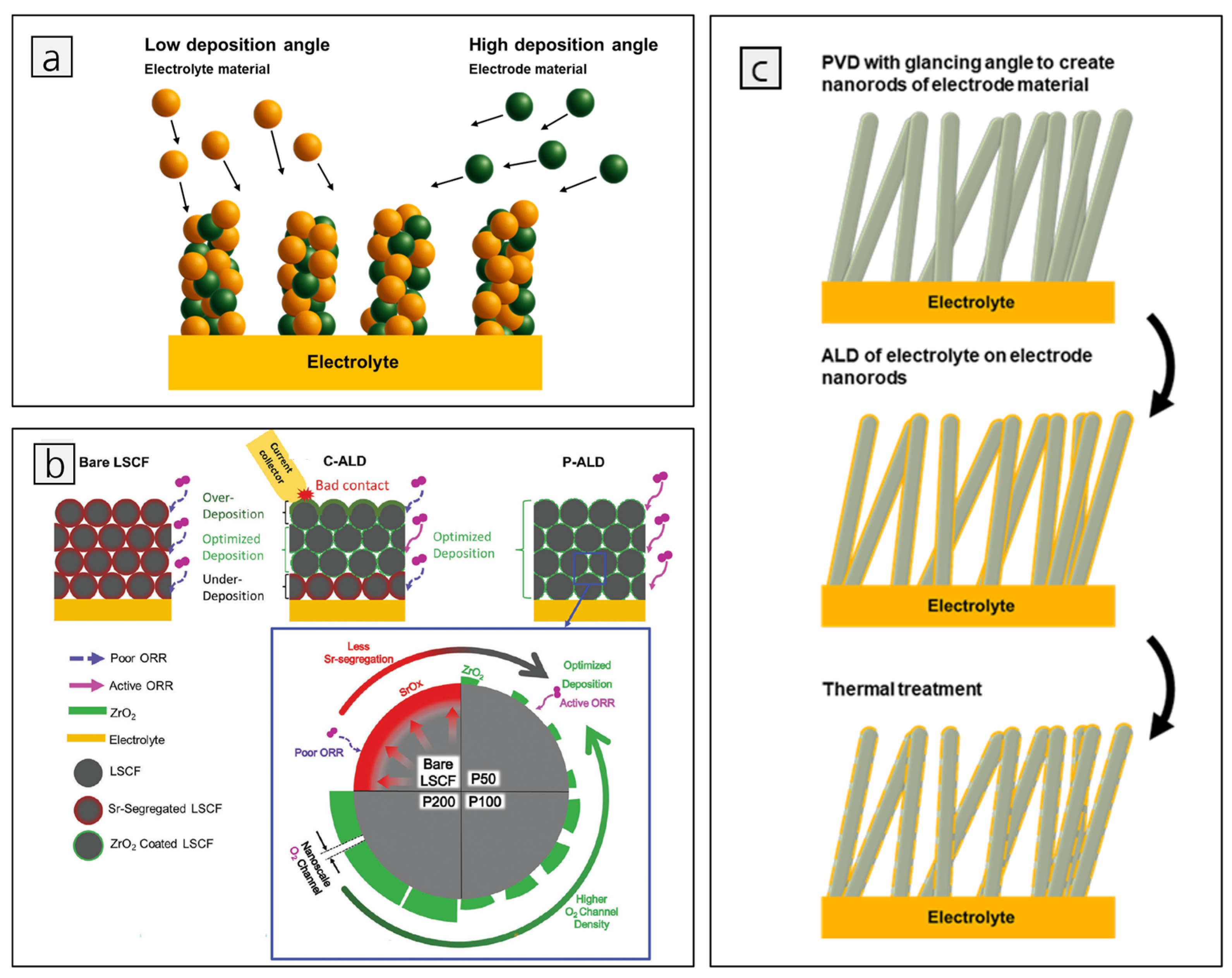 The approach of depositing nano-film coatings on electrolytic material over finely structured, porous layers of electrode material is intended to achieve a large surface area of TPB, with the material in the core serving as an electronic conductor. The film thicknesses of electrolyte materials ranged from 2 nm to 150 nm. The various studies have indicated that the mechanism for achieving enhanced TPB may differ. One investigation involved the fabrication of thin coatings ranging from 2 nm to 9 nm on nano-rods of Ni. Although complete coverage was not achieved at low thicknesses, the coatings still provided sufficient coverage for substantial performance enhancements. It was hypothesized that electrolyte nanofilms with reduced thickness would impede detrimental isolation, thereby facilitating simultaneous electron and ionic conduction [