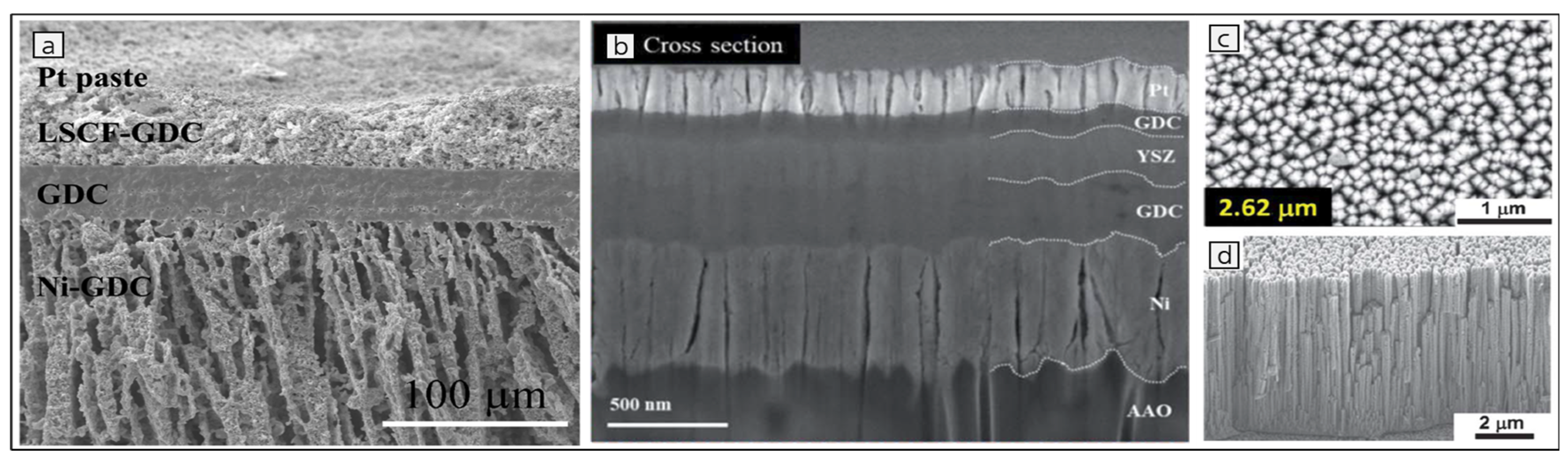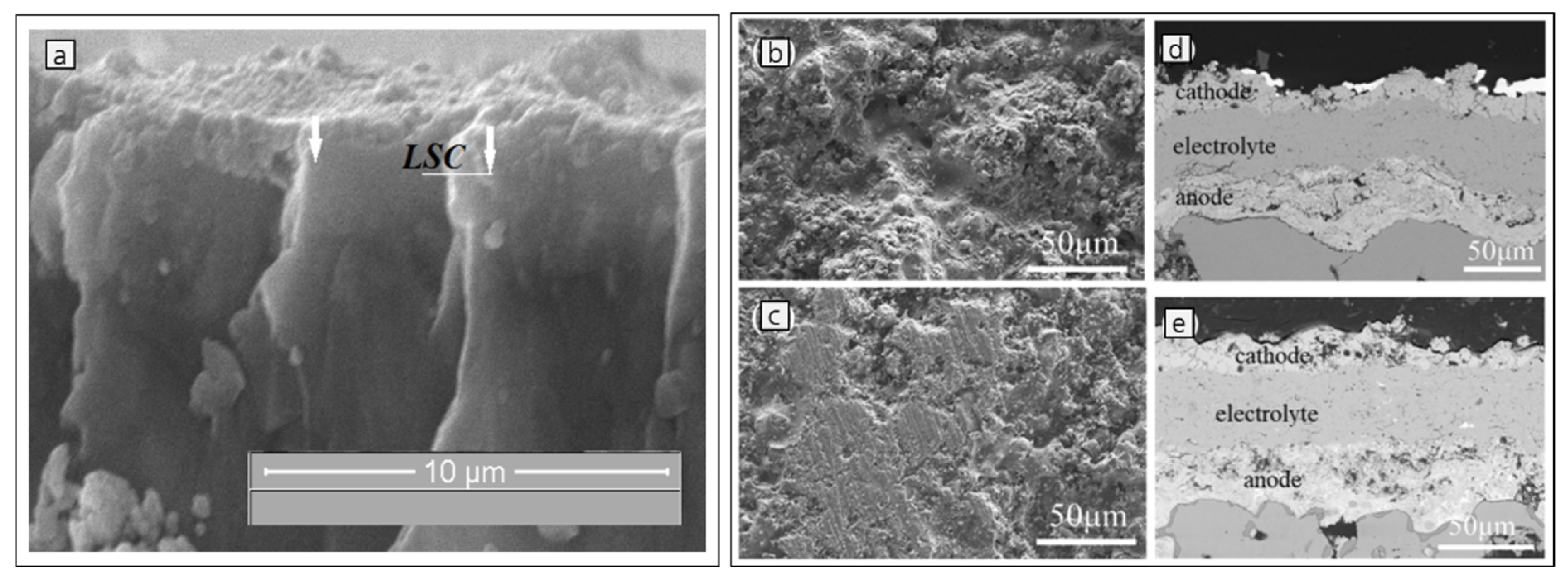 Dense interlayers of electrode materials have also been shown to increase the contact area between the electrode and electrolyte, thereby enhancing the adhesion between these components. In the three studies, layers with a thickness not exceeding 1 µm were fabricated. There is a need to preserve the effect of the interaction of all three phases for the electrochemical reaction, and thereby layer thicknesses have to be maintained at a minimum [