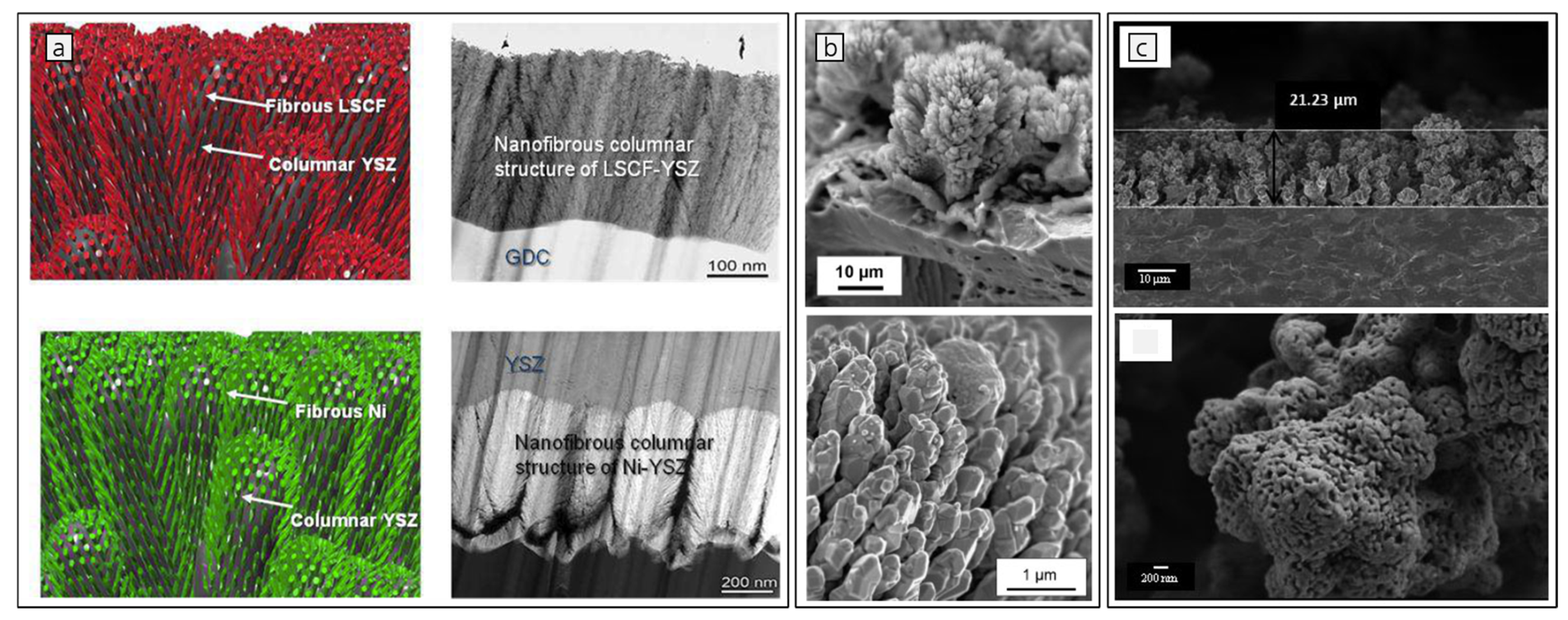 The objective of creating pores at the nanometer scale is to enhance gas accessibility to reaction sites. An increase in the number of nanopores directly corresponds to an increase in the number of points at which the gas phase meets the conducting material for ions and electrons. This, in turn, results in a direct extension of the TPB. Three distinct works sought to achieve this objective through the incorporation of nanosized pores with a vertical orientation, thereby facilitating unrestricted flow. One possibility, as presented in