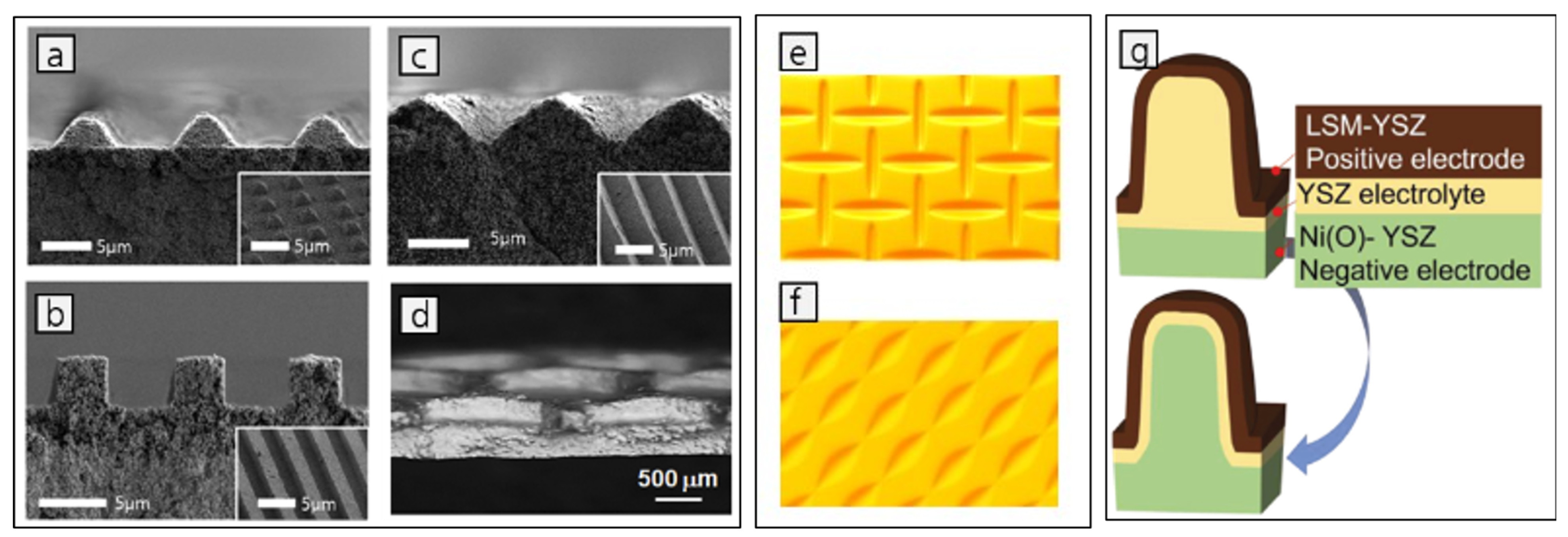 A frequently studied concept involves the creation of a three-dimensional contact surface between the electrolyte and the electrode. At this interface, all three phases meet: the ion-conducting electrolyte, the electrically conductive electrode material, and the gas phase in the electrode’s pores converge in the TPBs. Consequently, an increase in contact surface area through a three-dimensional design of the interface leads to an extension of the active cell surface area. The structuring of the three-dimensional interface was conducted by fabricating different features in the literature, involving pillars, pyramids, parallel walls, crossing lattice walls like waffle or honeycomb structures, and also creating pits into one component, as presented within