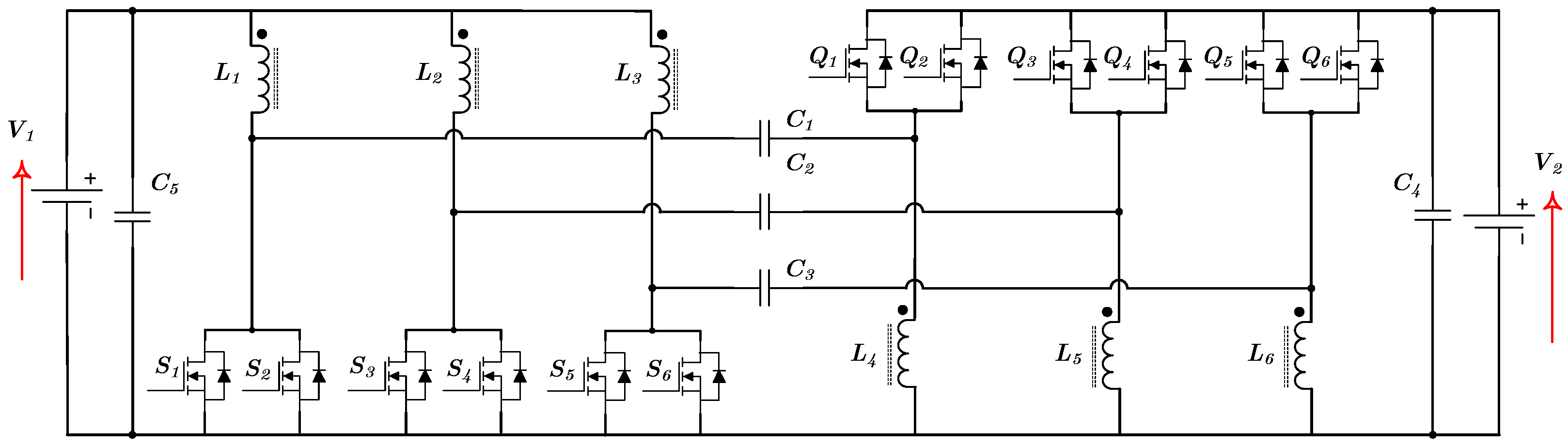 - Jiménez-Giménez, J.; Lázaro, A.; Mayor, Á.; López-López, J.; Barrado, A. New Bidirectional Isolated Three-Phase DC–DC Converter with Parallel-to-Serial Configuration for Energy Applications. IEEE Open J. Ind. Electron. Soc. 2025, 6, 459–477. [Google Scholar] [CrossRef]