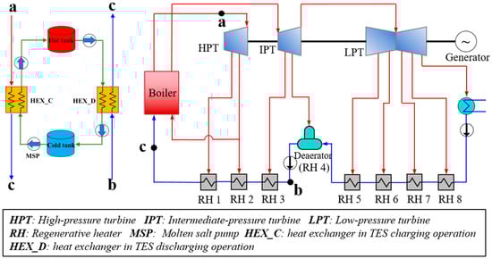 This study investigates the dynamics of a 330 MW subcritical coal-fired power unit integrated with molten salt TES. The coal-fired unit features a drum boiler with a single-reheat section and a regenerative system consisting of three high-pressure (HP) heaters, four low-pressure (LP) heaters, and one deaerator. The system layout is shown in Figure 1, and its key design parameters are listed in Table 1. Molten salt TES with a capacity of 50 MW/100 MWh is integrated into the case power plant.