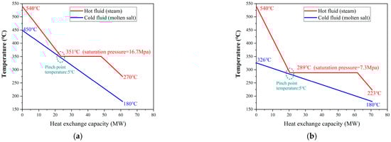 During the regulation process of molten salt TES, not only will the temperatures of the coal-fired power plant system change, but so will the hot and cold storage tanks of molten salt TES. Figure 2 and Figure 3 illustrate the T-Q diagrams characterizing the heat exchange between TES and the working fluid of the coal-fired unit during the charging and discharging phases, respectively. To provide a clearer representation of the molten salt’s temperature span, the T-Q diagrams for both the full-load (100% THA) condition and the minimum-load condition (40%THA) are provided here, with a pinch point temperature set at 5 °C.