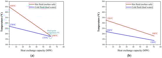 As shown in Figure 2, under the 100% THA condition, steam at 540 °C and 16.7 MPa can heat the molten salt from 180 °C to 450 °C. Under the 40% THA condition, however, the main steam pressure drops to 7.3 MPa, resulting in a lower saturation temperature and thus limiting the heating capacity. Consequently, the molten salt can only be heated from 180 °C to 326 °C. Therefore, when the unit operates under off-design conditions, the maximum heating temperature of the molten salt varies between 326 °C and 450 °C. In addition, the heat transfer rate also varies between 61 MW and 71 MW. Figure 3 illustrates the discharging phase where molten salt cools from 450–326 °C (determined by the unit load at charging) down to 180 °C, while simultaneously heating the boiler feedwater to a suitable temperature for boiler entry.