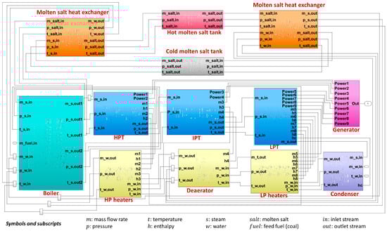 As illustrated in Figure 4, the power plant subsystems and molten salt TES unit were individually modeled in accordance with the laws of mass conservation and energy conservation, and subsequently integrated into a complete system. For the power plant, dynamic models were incorporated for key components, including the combustion furnace, economizer, steam drum, water wall, reheaters, superheaters, turbines, HP and LP heaters, condenser, and deaerator. For molten salt TES, the primary focus was placed on the dynamic characteristics of heat exchangers and storage tanks.