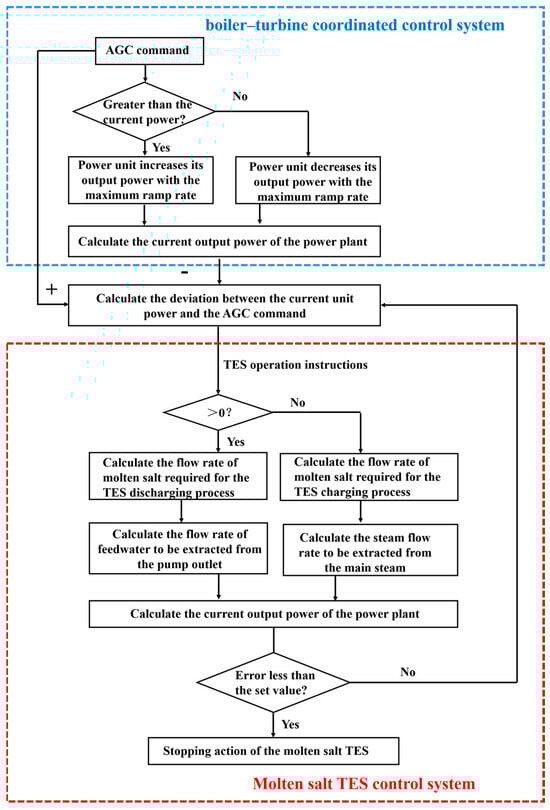 Upon receiving an AGC command, the boiler–turbine coordinated control system first adjusts the unit power at the maximum ramp rate. Subsequently, the current output power of the power plant is calculated, and the power deviation between this current power and the AGC command is determined, which is then fed into the molten salt TES control system as input to generate TES operation instructions.