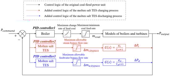 The above control process is achieved via Proportion–Integration–Differentiation (PID) controllers, as shown in Figure 6. PID controller 1 regulates the boiler’s coal feed rate so that it follows AGC commands while adhering to two operational safety constraints: the maximum/minimum coal feed rate that limits the unit’s safe operating load range, and the maximum rate of change in the coal feed that ensures the unit’s ramp rate remains within a safe margin. PID controller 2 compensates for power deviation during the molten salt TES charging process, operating within the limit of the maximum allowable steam bypass flow rate. Similarly, PID controller 3 compensates for power deviation during the molten salt TES discharging process, constrained by the maximum allowable feedwater bypass flow rate.