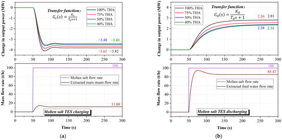 Power response characteristics during molten salt TES operation. (a) Molten salt TES charging process. (b) Molten salt TES discharging process.