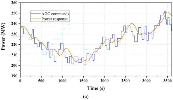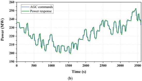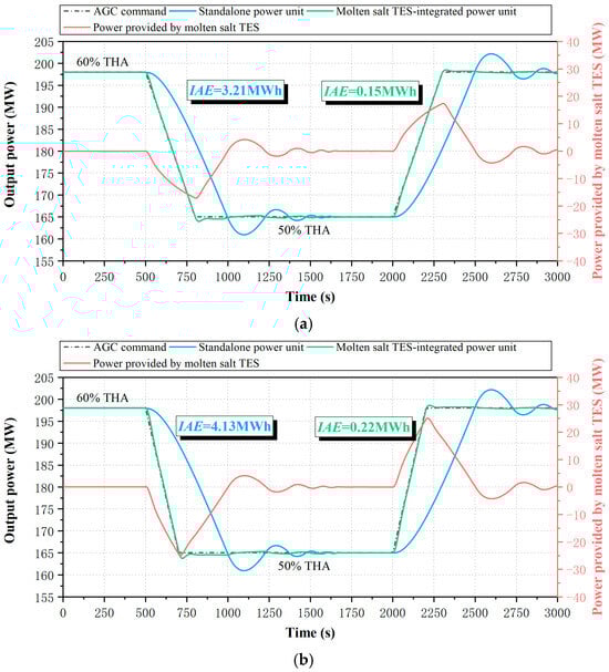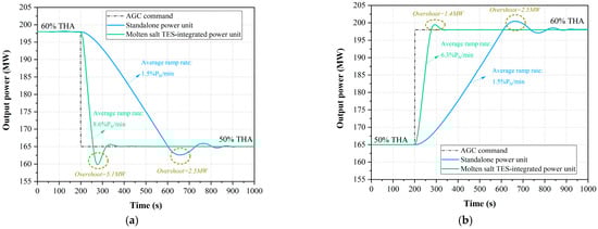 This section further quantifies the dynamic performance of the molten salt TES-integrated power unit in responding to actual AGC commands, as shown in Figure 10. Figure 10a reveals limitations in the standalone power unit’s dynamic performance, including inadequate ramp rates, recurrent overshoot, reverse regulation during AGC tracking. In contrast, with molten salt TES integration, Figure 10b shows notable enhancements in response quality, where these undesirable phenomena are substantially suppressed.