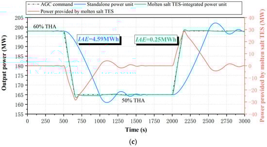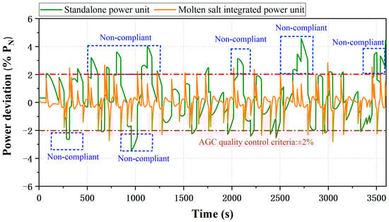 China’s AGC market regulations stipulate that power deviation should not exceed ±2% of the unit’s design load [41]. As depicted in Figure 11, compared to the standalone power unit, the TES-integrated system maintains power deviation within this threshold during AGC operation, demonstrating the practical value of TES in meeting grid code requirements.