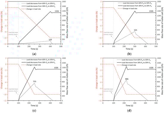 Two load decrease processes with equal magnitude were simulated for the integrated system: (1) from 60%PN to 50%PN, and (2) from 30%PN to 20%PN. As shown in Figure 13, the real-time required mass flow rate of molten salt was compared during these processes, revealing distinctive system dynamics under ultra-low load conditions.