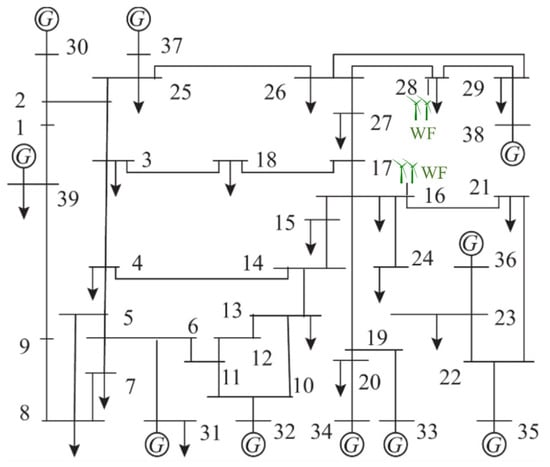 To validate the effectiveness of the proposed probabilistic assessment framework, simulation analyses are conducted based on a modified IEEE 39-bus system whose topology and component parameters can be found in [39], as shown in Figure 2. The original conventional generators at bus 16 and bus 28 are replaced with two wind farms (labeled as ‘WF’) with capacities of 573 MW and 650 MW, respectively, resulting in a wind power penetration level of approximately 20%. The cut-in, cut-out, and rated wind speeds for the turbines are set to 4 m/s, 25 m/s, and 9.8 m/s [40], respectively. Load demand is treated as a random variable following a normal distribution with a standard deviation equal to 10% of its mean. For frequency response modeling, wind farms are assumed to provide no frequency support, while all other synchronous generators participate in primary frequency regulation with a unified set to 25 p.u. The value of describing the frequency sensitivity of load is set to 1.5 p.u. [41].