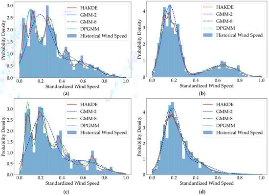 This section aims to validate the superiority of the proposed HAKDE method in characterizing wind power uncertainty under typhoon disasters. Wind speed data set from a meteorological station in Southern China, encompassing Typhoon Mangkhut (Super Typhoon), Typhoon Nida (Strong Typhoon), Typhoon Merbok (Severe Tropical Storm), and a normal wind period, is used as samples. For comparison, the second-order GMM (GMM-2), the eighth-order GMM (GMM-8), and DPGMM are also employed. As mentioned before, the DPGMM, as a non-parametric Bayesian method, automatically determines the optimal number of mixture components from the data, giving it an inherent advantage in handling complex distributions.