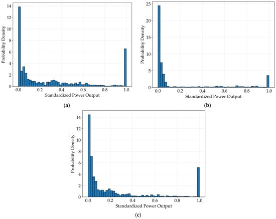 (a) The wind power output distribution histogram of typhoon Mangkhut; (b) The wind power output distribution histogram of typhoon Nida; (c) The wind power output distribution histogram of typhoon Merbok.