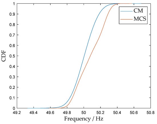 Figure 9, Figure 10 and Figure 11 show the CDFs of the system frequency, selected branch active power flows, and nodal voltage magnitude, respectively. For quantitative accuracy assessment, the average root mean square () is adopted as the metric. Assuming comparison points, with the CDF values from the CM and MCS at the l-th point denoted as and , respectively, the is calculated as [43]: