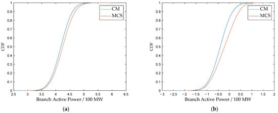 (a) CDF comparison of active power in branch 6–7: CM vs. MCS; (b) CDF comparison of active power in branch 16–24: CM vs. MCS.