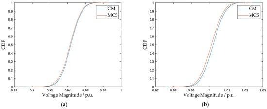 (a) CDF comparison of voltage magnitude at bus 7: CM vs. MCS; (b) CDF comparison of voltage magnitude at bus 16: CM vs. MCS.