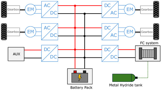 Schematic representation of Smilla H2 powertrain. Please note that AUX means all the auxiliaries and services of the vehicle (including sensors, cameras, and the FC system BoP), which are powered by a 12 V DC bus generated from the main 48 V DC bus using a DC-DC converter.