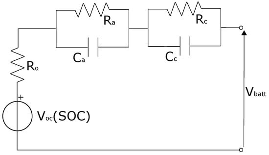The battery pack was modeled using the equivalent circuit model shown in Figure 4 [56]. This model considered two polarization processes [57], namely activation and concentration, and the ohmic resistance. The open circuit voltage was modeled as a function of the State of Charge (SOC) according to LFP chemistry cells. The numerical model of the battery pack was limited to the electrical behavior and neglected thermal aspects. Indeed, the battery pack was tested on a test bench with a programmable unit composed of an electronic load and a power supply to perform charge and discharge cycles. During those tests, the charging current was set at 0.25C, while the discharging current was set at 0.5C. With a constant ambient temperature of 25 °C, the maximum recorded temperature during those cycles was equal to 35 °C. Consequently, since it was far from the maximum operating temperature of 65 °C declared by the cells’ manufacturer, the thermal model of the battery pack was deemed unnecessary for the proposed analysis.