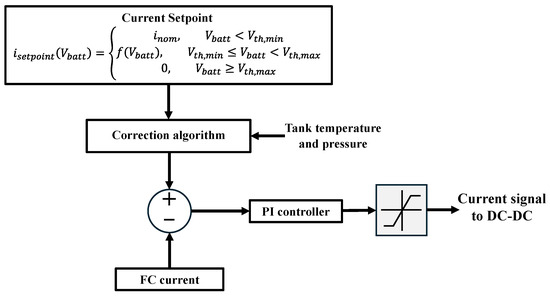 As for the vehicle control strategy, two layers were defined, one determining the EM control signals and the other defining the fuel-cell range-extender control. As for the EM control, a proportional-integral (PI) controller was implemented for each motor. Given the wheels’ reference speeds, calculated by the autonomous-driving algorithm and corresponding to the PI setpoints, the difference between them and the actual speeds determined the torque commands for the EMs. The adopted controller coefficients were = 290 and = 300. As for the range-extender control strategy, the power conditioning unit was represented by the DC-DC converter. This device was controlled in current mode; thus, the control strategy had to determine the current signal. Also in this case, a PI-controlled was implemented [65]. In detail, the PI input signal corresponded to the fuel-cell current upstream the DC-DC converter, while the setpoint was determined considering a reference value, equal to 6 A and corresponding to a fuel-cell power output of approximately 270 W, which was adjusted considering the actual battery voltage and the temperature and pressure of the MH tank. Indeed, if the tank temperature and pressure were lower than certain threshold values, the current setpoint was reduced to avoid possible hydrogen depletion at the stack anode. The adopted PI controller coefficients were = 0.1 and = 0.05. A schematic representation of the range-extender control strategy is shown in Figure 5. The values of and were set to 54.4 V (average BP cell voltage of 3.4 V) and to 56 V (average BP cell voltage of 3.5 V), while was set to 6 A.