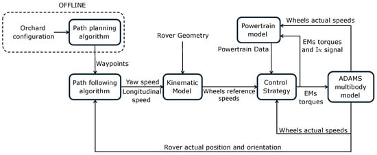 The autonomous-driving algorithm implemented within the co-simulation model was specifically designed by the authors, based on algorithms available in the literature, for an autonomous rover operating in vineyards and orchards, and consisted of the following main elements: