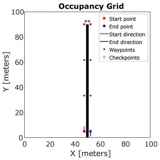 A detailed description of the algorithm is available in the literature in other works from the same research group [24,48]. The path-planning algorithm defined the ideal trajectory according to the orchard configuration and the specific task. The algorithm was based on Dubins’ geometrical planner [49,50], thus the ideal trajectory was determined by combining segments and circular arcs given the start and arrival point and their relative orientation in the map. The ideal trajectory was defined as a sequence of points called waypoints, which were spaced according to a predefined parameter called the waypoints pitch distribution (WPP).