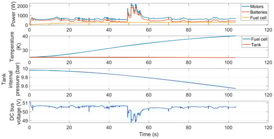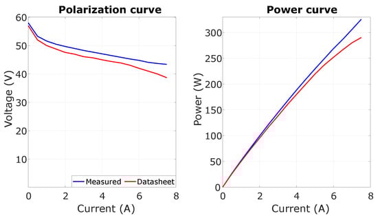 The fuel-cell system was modeled as a voltage source using a lookup table that followed the FCS-C300 voltage–current curve. In addition, a thermal model, consisting of a controlled heat-flow-rate source and a convective heat-transfer element, was added to evaluate the thermal behavior. The heat flow was determined according to the actual fuel-cell stack efficiency and power output. As for the hydrogen consumption, the manufacturer of the system provided the hydrogen-consumption curve according to the output current of the stack. The actual polarization curve and the parameters of the thermal model were determined through experimental tests on the system. The experimental setup consisted of the fuel-cell system, a power supply for providing the FC controller’s 12 V, an electronic load (model EA-EL 9080-400 manufactured by Elektro-Automatik GmbH & Co., Viersen, Germany), a thermal camera (model FLIR E4 manufactured by Teledyne FLIR LLC, Wilsonville, OR, USA), and the MH tank. The tests were conducted varying the current absorbed by the electronic load at fixed steps from 0 to 7.5 A. During the tests, the ambient temperature was maintained at 25 °C. The test results will be described in Section 3. This approach was considered valid since this system is an open-cathode system that adopts blowers to feed air at the cathode instead of an air compressor. In high-power stacks that feature the presence of the air compressor, the dynamic behavior is critical as the compressor has a certain dynamics that may be a limiting factor for the system output [58]. Furthermore, given the range-extender configuration, the power output of the fuel-cell system was characterized by smooth and little variations, reducing the relevance of the system dynamics. To account for the power consumption of the system controller, which comprised the power absorbed by the blowers and the valves (substantially, it represented the power absorption of the system balance of plant), a DC load was added on the DC bus in the numerical model.