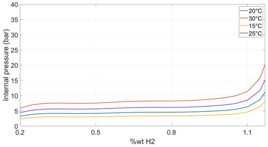where represents the hydrogen-to-metal atomic ratio and is the equilibrium pressure at the reference temperature . During desorption, heat is absorbed by the tank. The thermal behavior of the tank affects the chemical reaction and the equilibrium pressure; thus, it must be included. In the numerical model, conductive and convective heat-transfer elements were implemented, the first accounting for the tank wall thickness and the latter for the heat exchanged with the ambient air. However, the heat absorbed by the tank during the desorption process must be evaluated. To address this, the following equation was adopted [60]: