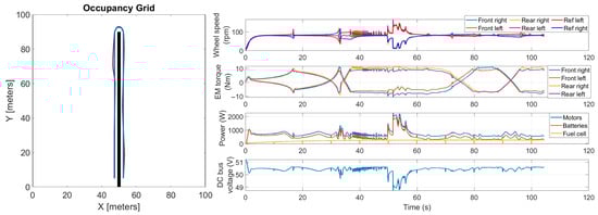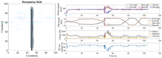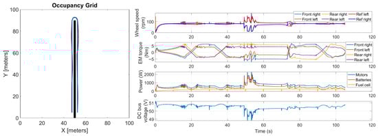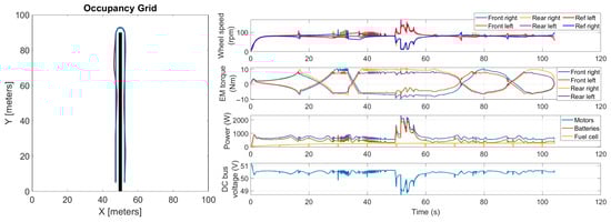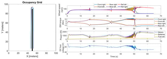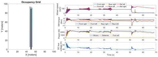 Summarizing, the main feature of the proposed co-simulation model is that it integrates all the relevant stages of the autonomous-driving strategy, the rover multibody model, and the powertrain model, including the motors’ control strategy and the fuel-cell hybrid powertrain energy-management algorithm. By combining all these aspects and accounting for their interactions, the model provides a comprehensive representation of the rover under typical work scenarios. Furthermore, the model allows for testing in a virtual environment different operating conditions.