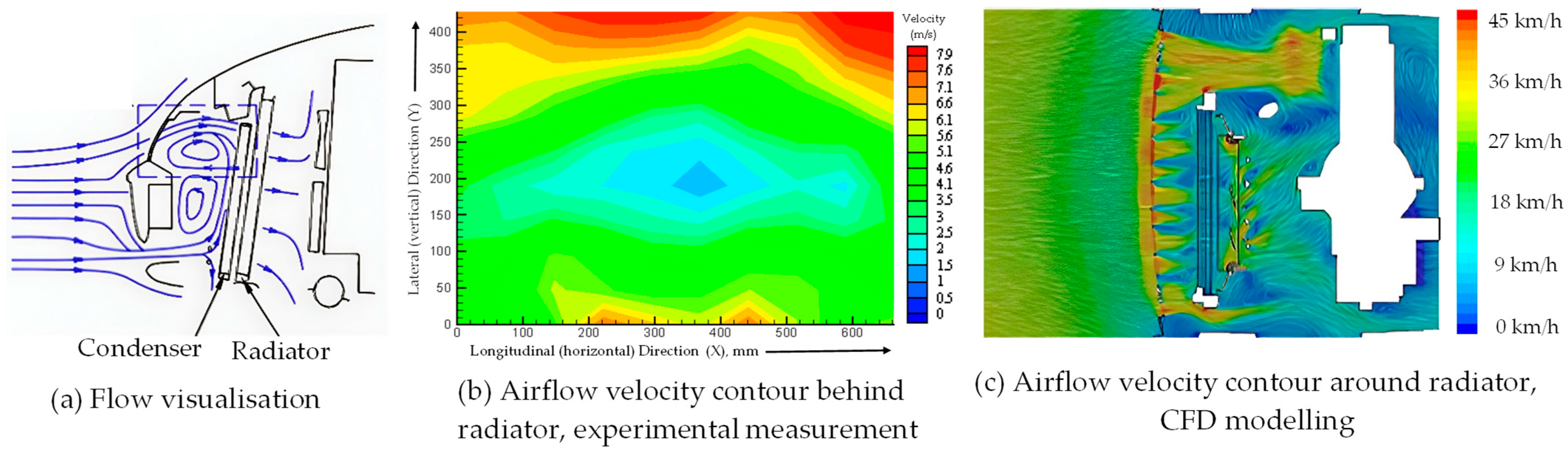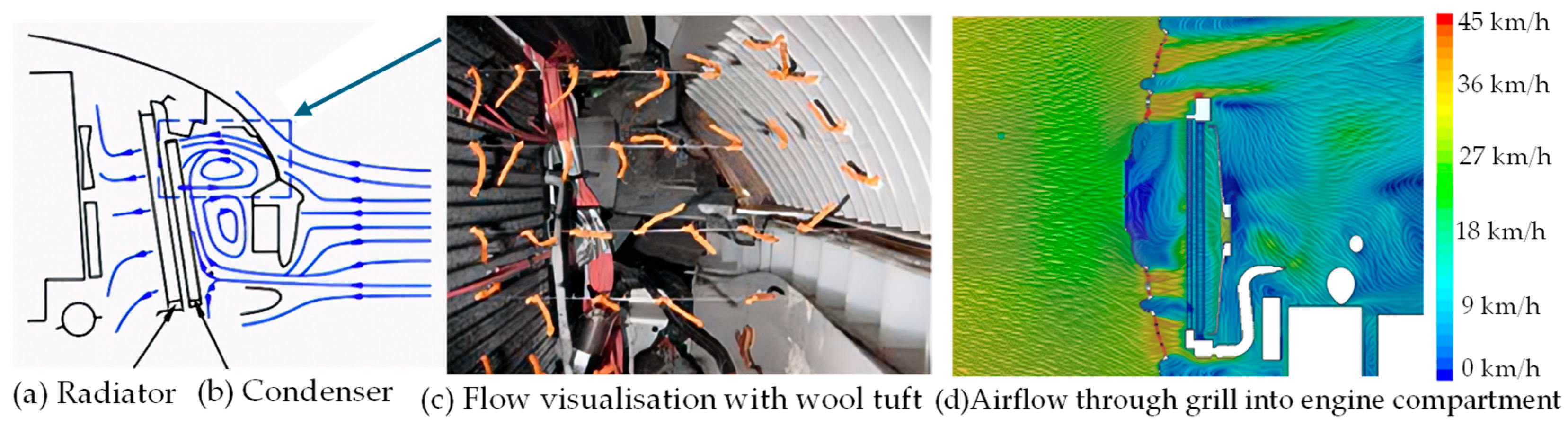 - Hobeika, T.; Sebben, S.; Lofdahl, L. Experimental and numerical investigation of cooling drag. Proc. Inst. Mech. Eng. Part D J. Automob. Eng. 2017, 231, 1203–1210. [Google Scholar] [CrossRef]
