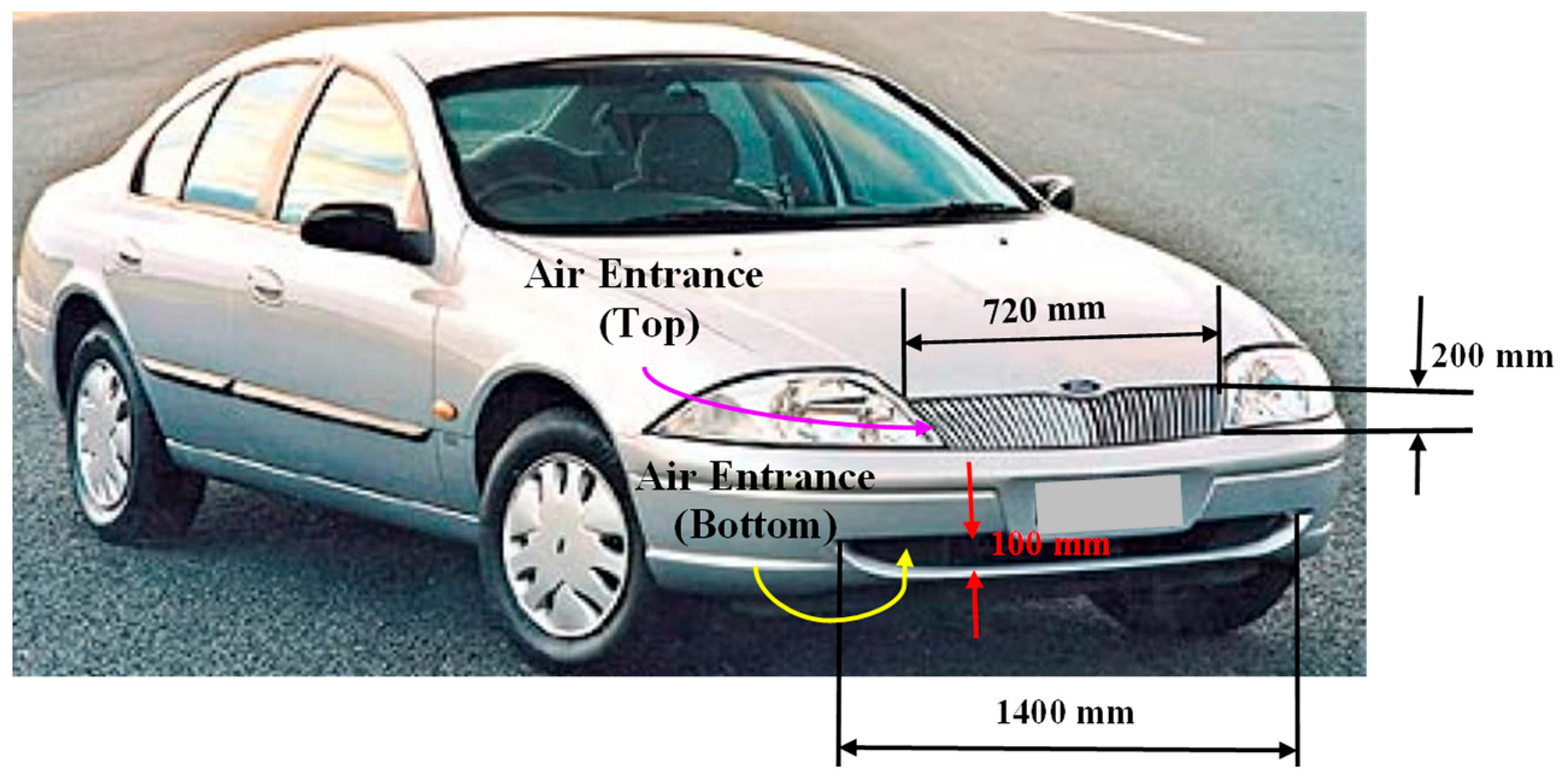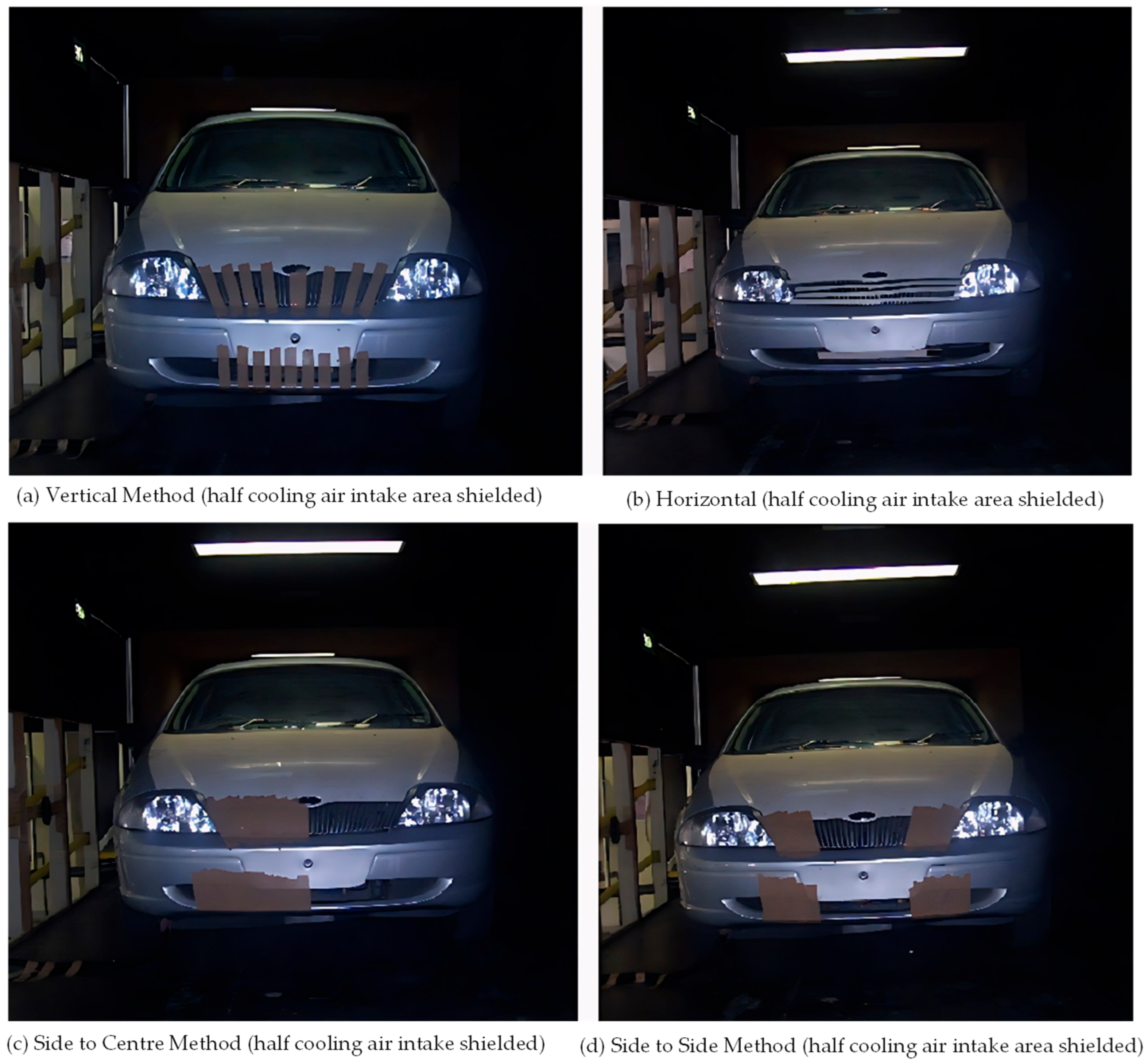 - Ng, E.; Watkins, S.; Johnson, P.W.; Grant, L. Wind Tunnel Tests of Vehicle Cooling Performance at High Blockage; SAE 2000-01-0351; SAE World Congress: Detroit, MI, USA, 2000. [Google Scholar] [CrossRef]
