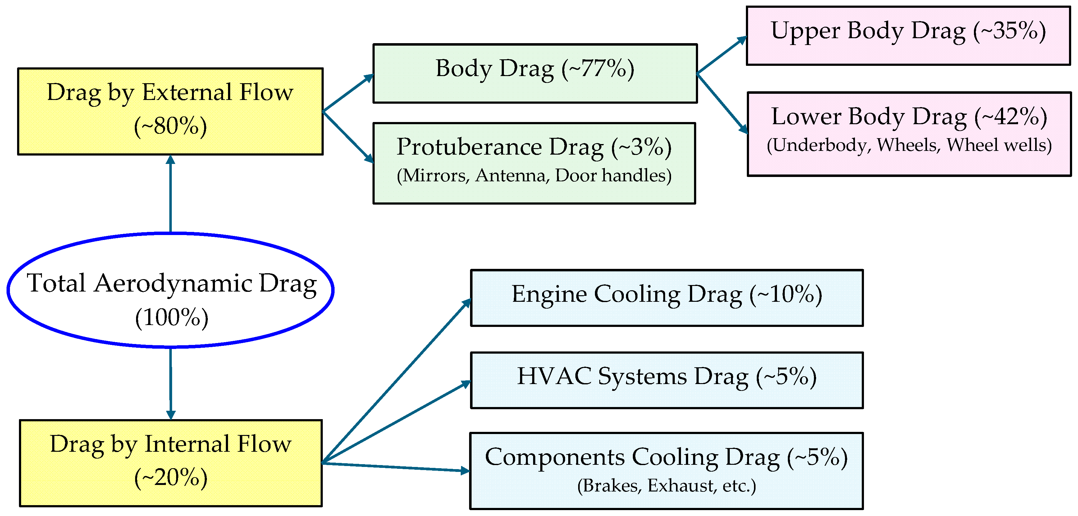 - 10–15%: (or more): Cooling drag is more common in large family-sized passenger vehicles or is typical for high-performance cars and sports cars. These vehicles have powerful engines generating a lot of heat, requiring large radiator surfaces and significant air intake areas, which disrupt airflow.
