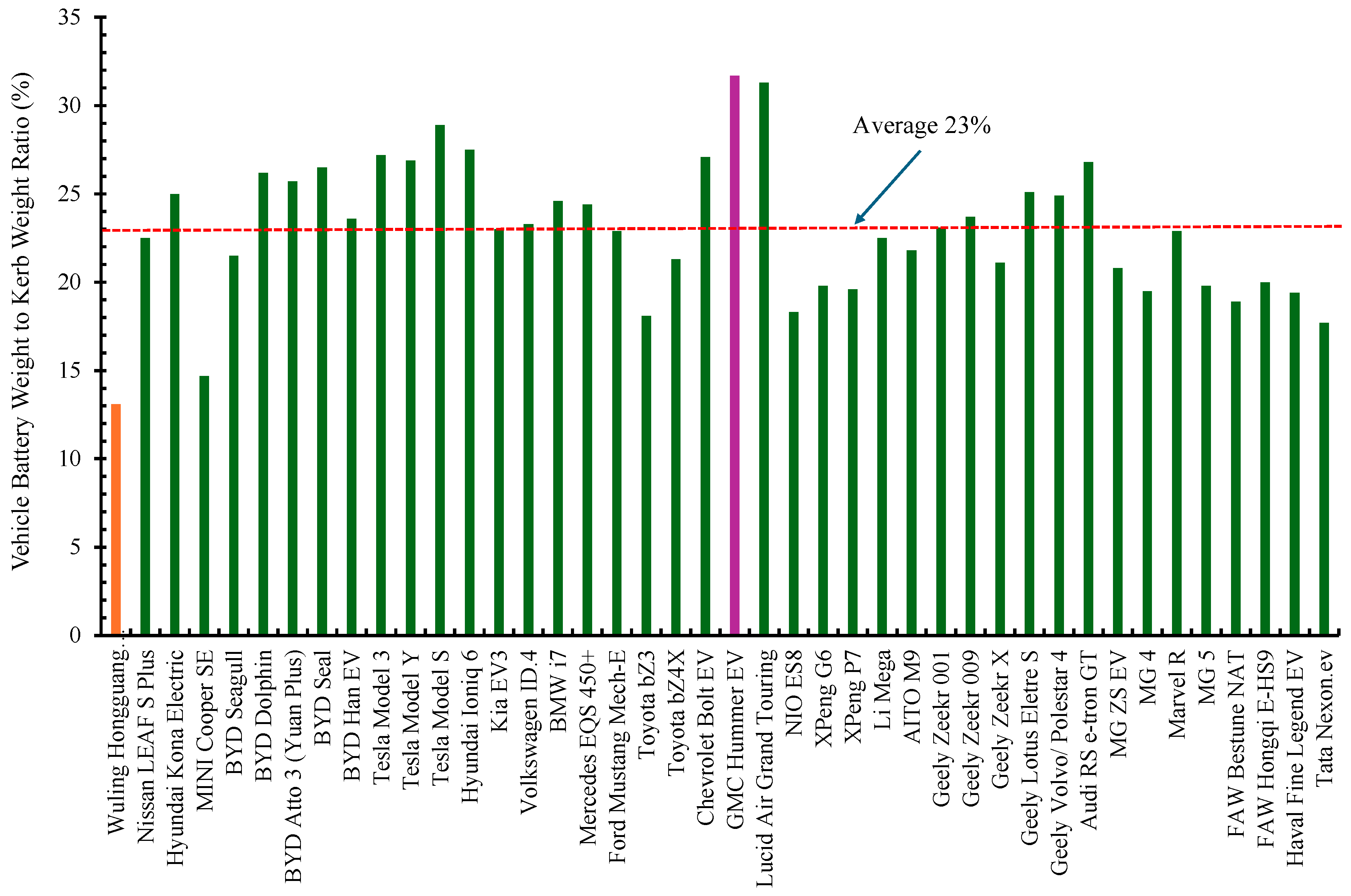 | Wuling Hongguang Mini EV | 13.8 kWh | 90 kg | 685 kg | 13.1% |