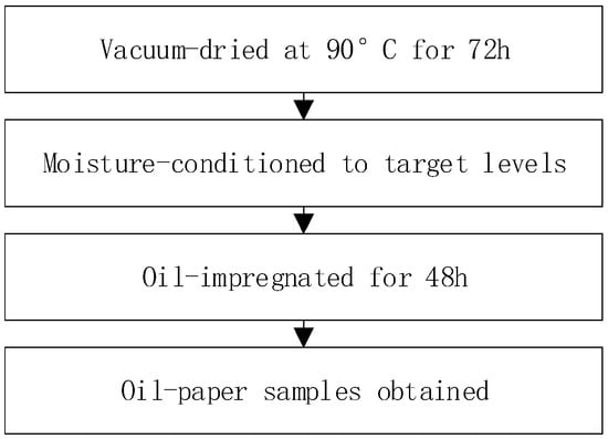 The moisture-conditioning process is illustrated in Figure 1. The dried insulating paperboard was placed on an electronic balance and exposed to ambient air for natural moisture absorption. Based on the balance readings, changes in moisture content were roughly estimated. When the mass approached the target value, samples were taken and measured using a moisture analyzer (balance range 1–60 g, precision 0.001 g; analyzer accuracy 0.01%). The measured value was recorded as the paperboard’s moisture content. Immediately afterward, the paperboard was immersed in the dried insulating oil and sealed at room temperature for 48 h to achieve complete impregnation.