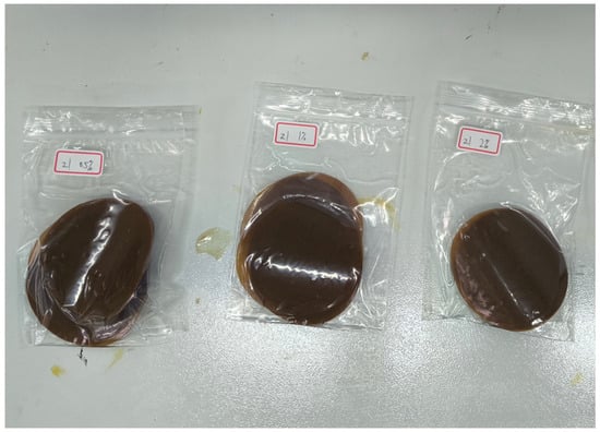 By controlling the natural moisture absorption time, oil–paper insulation samples with moisture contents of 0.96%, 1.98%, 2.84%, 3.51%, and 4.06% were prepared. The overall preparation process and final samples are shown in Figure 1 and Figure 2, respectively.