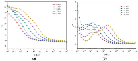 The FDS characteristic curves of oil–paper insulation samples with different moisture contents are shown in Figure 3. Figure 3a presents the real component (C′) of the complex capacitance as a function of frequency. For all samples, C′ decreases with increasing frequency, with the most pronounced differences observed in the low-frequency region. As the moisture content increases, C′ values at low frequencies rise significantly, indicating that moisture enhances the polarization capability of the oil–paper system. This effect is most evident at low frequencies, where interfacial polarization dominates. At higher moisture levels, water molecules form hydrogen bonds with cellulose chains and increase the free-ion concentration, promoting charge accumulation at interfaces and thus intensifying interfacial polarization, which elevates low-frequency C′ values. As frequency increases, polarization mechanisms gradually shift from interfacial to dipolar polarization. The polarization response can no longer follow rapid field variations, causing the C′ curves for samples with different moisture contents to converge in the high-frequency range [20,21]. Figure 3b illustrates the imaginary component (C″) of the complex capacitance. With increasing moisture content, the peak positions of C″ shift toward higher frequencies, and the low-frequency values increase notably. This behavior indicates that moisture has a strong influence on dielectric loss. In the low-frequency region, moisture promotes ionic conduction and interfacial polarization, leading to higher C″ values. In the low-frequency region (<10 Hz), the imaginary capacitance (C″) generally increases with moisture content. However, the sample with the highest moisture content (4.06%) exhibits a slightly lower C″ value than the 3.51% sample at the very lowest frequencies, which may be attributed to the saturation of interfacial polarization or competing ion migration effects at extremely high moisture levels. The overall trend of increasing dielectric loss with moisture content remains clear. As the moisture content rises, polarization effects become more pronounced, further enhancing dielectric loss. The interaction between water molecules and cellulose facilitates ion migration and interfacial charge accumulation, resulting in greater dielectric losses at low frequencies. At higher frequencies, the polarization response cannot keep pace with the applied field, and the imaginary component tends to stabilize.
