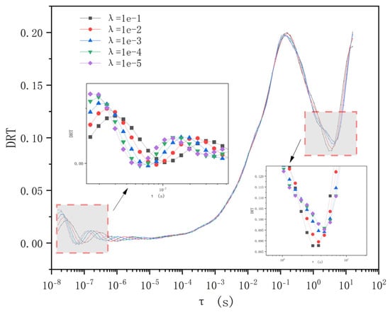To investigate the influence of λ, the real part of the complex capacitance data for an oil–paper sample with a 0.96% moisture content was used. Regularization parameters of λ = 10−5, 10−4, 10−3, 10−2, and 10−1 were tested. The corresponding DRT results are shown in Figure 5.