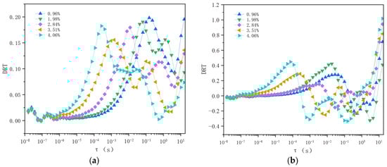 Figure 5 illustrates the DRT curves obtained from the same experimental data (C′ of the 0.96% sample) under different regularization parameters λ. The goal is to select a λ that produces a physically plausible, smooth DRT without overfitting the experimental noise. At very small λ (e.g., 10−5), the solution is under-smoothed, resulting in sharp, likely artifactual peaks at short relaxation times. At very large λ (e.g., 10−2), the solution is over-smoothed, erasing meaningful structural details. A value of λ = 10−3 was selected as it yields a smooth curve while retaining the distinct relaxation peaks, representing the best trade-off between fidelity to the data and suppression of noise [22].